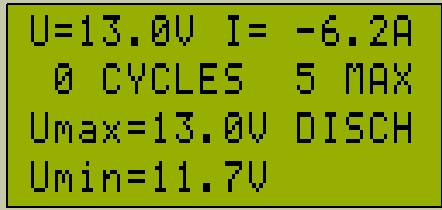 В верхней строке отображаются напряжение аккумулятора и ток заряда или разряда, во второй строке - количество пройденных циклов заряд/разряд и количество предварительно установленных циклов, в третьей строке - максимальное предварительно установленное значение напряжения заряда и режим работы устройства (заряд или разряд). В четвертой строке отображается предварительно установленное значение минимальное значение напряжения.