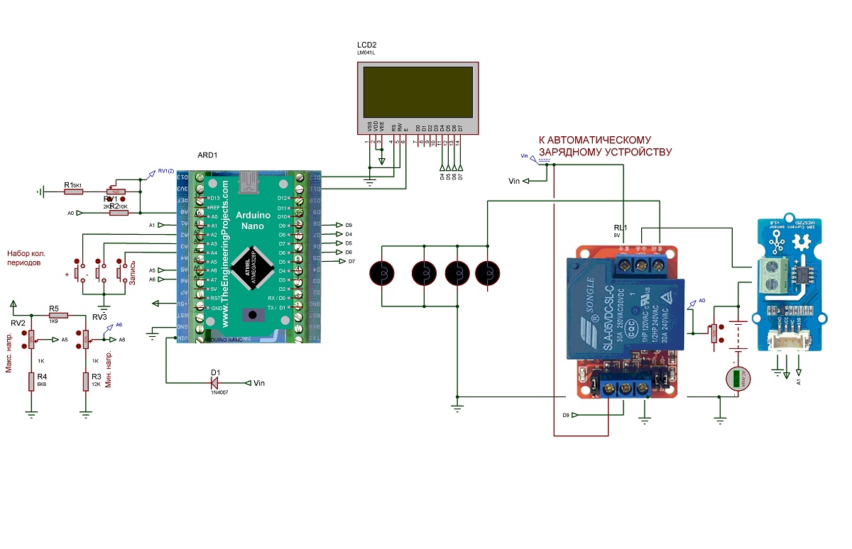 Сердцем устройства является Ардуино Нано. Для установки максимального напряжения заряда и минимального напряжения разряда служат потенциометры RV2,RV3. Потенциометром RV1 устанавливается точность измерения напряжения аккумулятора. Количество циклов заряда-разряда и запись в EEPROM осуществляется кнопками.Вход релейного модуля 30А SPDT для переключения с разряда на заряд и наоборот подключен к выходу D9 Ардуино. В качестве нагрузки для разряда аккумулятора применены автомобильные светодиодные лампы 25вт каждая. Изменяя количество ламп можно изменять ток разряда. Выход датчика тока ACS725 10A подключен к аналоговому входу А1. Напряжение аккумулятора проверяется на аналоговом входе А0.