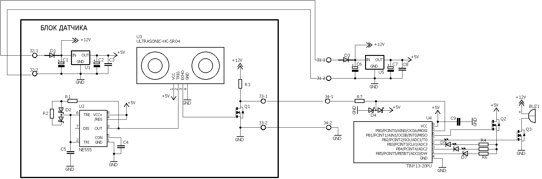 Микропроцессор Attiny13 измеряет длительность этого импульса и выдает информацию на светодиоды D5, D6,D7. Когда расстояние до препятствия менее 3м, включается светодиод D7, менее 2-х метров - светодиоды D6,D7. Когда расстояние доходит до 1,2м, включаются светодиоды D5,D6,D7 и бузер BUZ1. Подробнее на видео.
