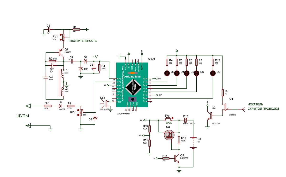 Для определения скрытой проводки антенну, состоящую из куска провода длиной около 10см и подключенной к затвору транзистора Q4 необходимо поднести к стене. При наличии скрытой проводки с переменным напряжением частотой от 40 до 60Гц включаются одновременно все светодиоды D3 - D6 и работает бузер. Ардуино осуществляет цифровую фильтрацию этих частот. Подробнее на видео.