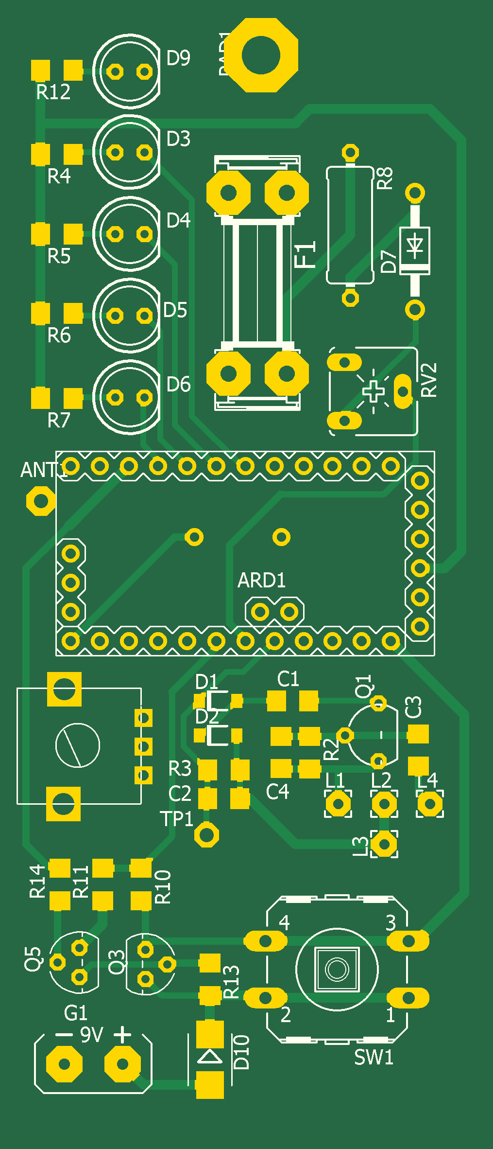 Питание 9В от 6-ти аккумуляторов ААА. Питание включается кнопкой SW1, при этом включается светодиод D9. Выключается автоматически через 5мин. после прекращения работы.