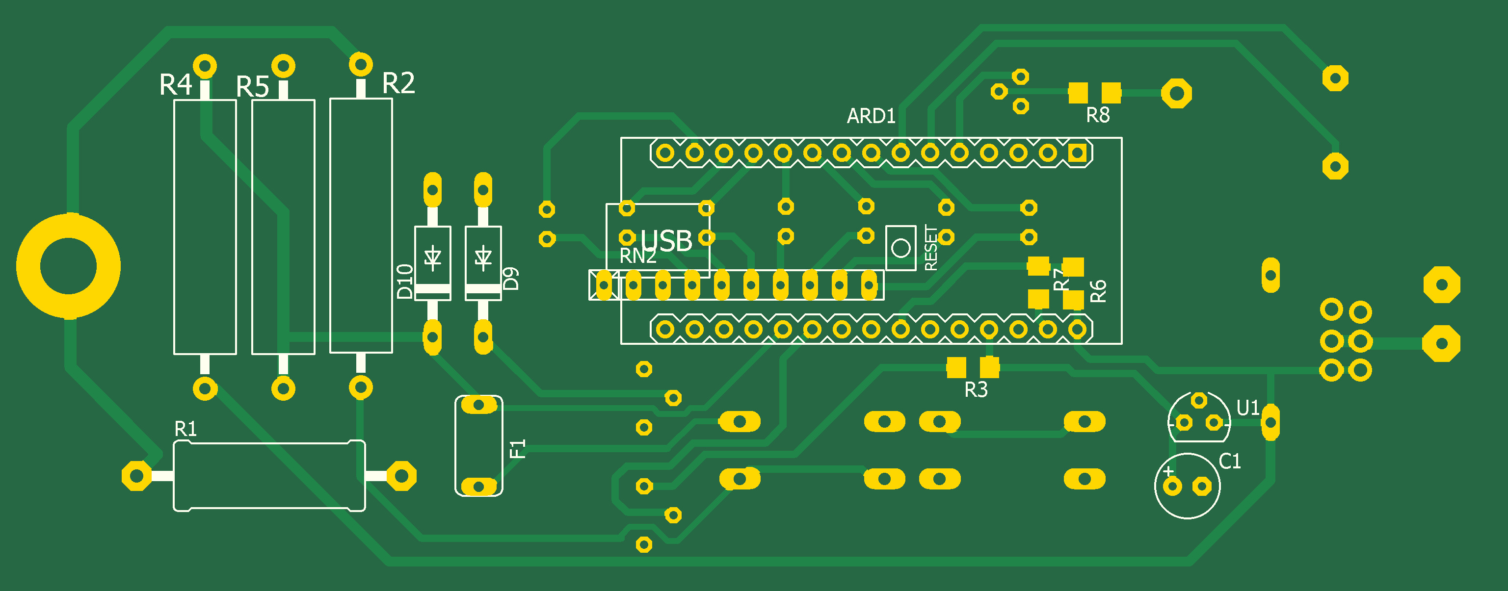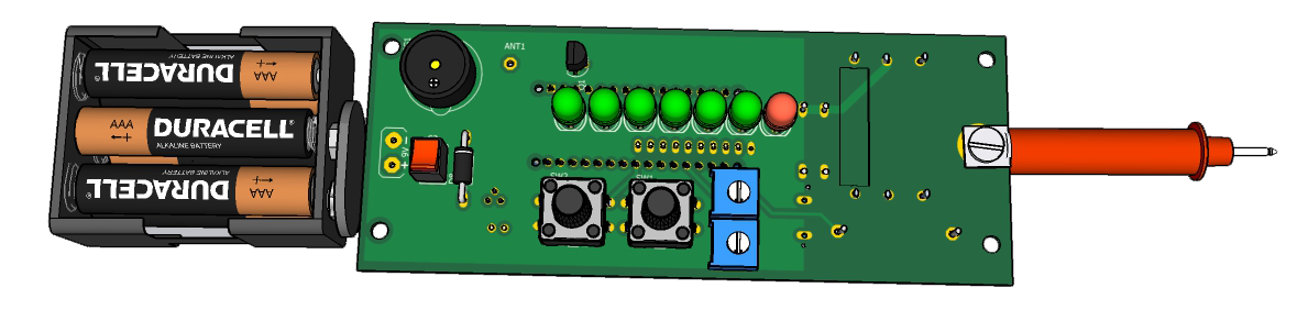 Для прозвонки цепи необходимо замкнуть кнопку SW1. При этом между сопротивлением R4 и прозваниваемой цепью образуется напряжение, которое поступает на вход АЦП А1 модуля Ардуино. Позвонка начинает срабатывать при сопротивлении цепи между входом щупа и общим менее 120 Ом. Порог срабатывания прозвонки устанавливается подстроечником RV2. Если случайно нажать на кнопку SW1 при подключении пробника к сети переменного тока, срабатывает зуммер SG1 и через 2сек. отключается самовосстанавливающийся предохранитель F1. Таким образом осуществляется защита цепи прозвонки.