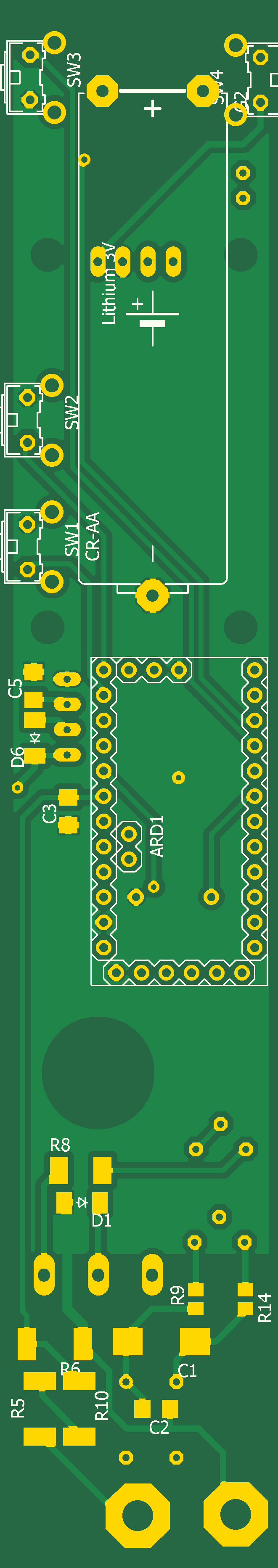 Для записи измеряемого значения напряжения или сопротивления необходимо нажать кнопку SW1, для последующего просмотра нажать SW2. Для питания пробника применен цилиндрический Li-Ion аккумулятор 3,7V CRAA. Питание включается кнопкой ON, выключается кнопкой OFF. Скетч для Ардуино Мини выполнен в среде FLPROG 7.3.8.