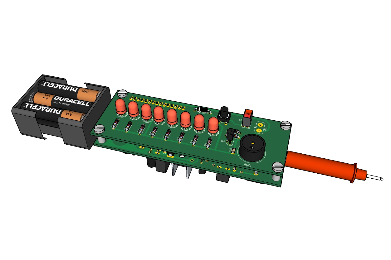 С помощью данного пробника можно проводить индикацию постоянного напряжения от 3-х до 48В, переменного напряжения до 380В, прозванивать цепи, проверять сопротивления цепей от 0 до 600 Ом, а также определять скрытую проводку. При разряде аккумуляторной батареи до 7В при замыкании контактов щупа все светодиоды начинают мигать. Пробник выполнен на микроконтроллере Atmega8.