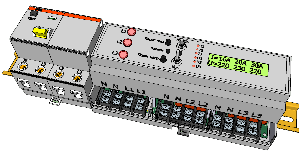 Для отключения нагрузки при превышении предварительно установленных значений напряжения или тока до 50А в 3-х фазной сети применяется 3-х фазное устройство защитного отключения (УЗО) 63A 3P+N 30mA . Все значения порогов записываются в память микроконтроллера Atmega8. Для индикации значений токов и напряжений в каждой фазе применяется 2-х строчный 16-ти символьный LCD индикатор.