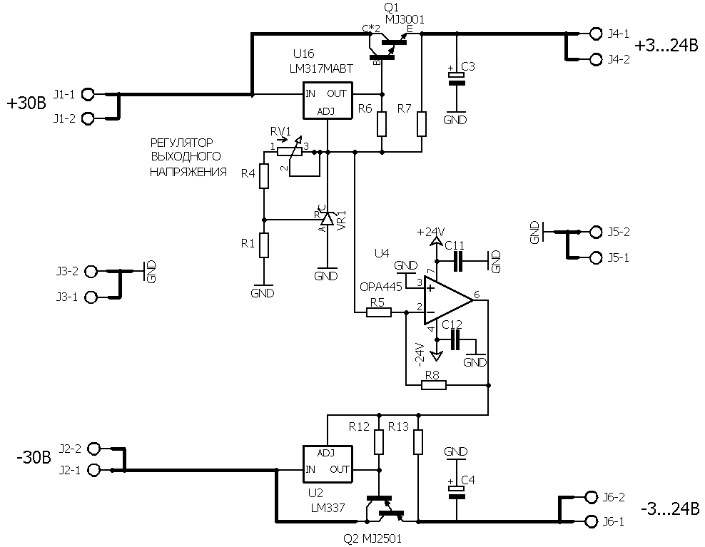 Источник положительного напряжения выполнен на миросхеме U16 типа LM317. Для достижения выходного тока 8А к ней подключен транзистор Дарлингтона MJ3001. Источник отрицательного напряжения выполнен на миросхеме U2 типа LM337. Для достижения выходного тока 8А к ней подключен транзистор Дарлингтона MJ2501. Оба источника имеют общий источник опорного напряжения на регулируемом стабилитроне VR1 TL431 и общий регулятор выходного напряжения RV1. Таким образом устанавливается одинаковое значение как положительного так и отрицательного напряжения от±3В до ±24В.