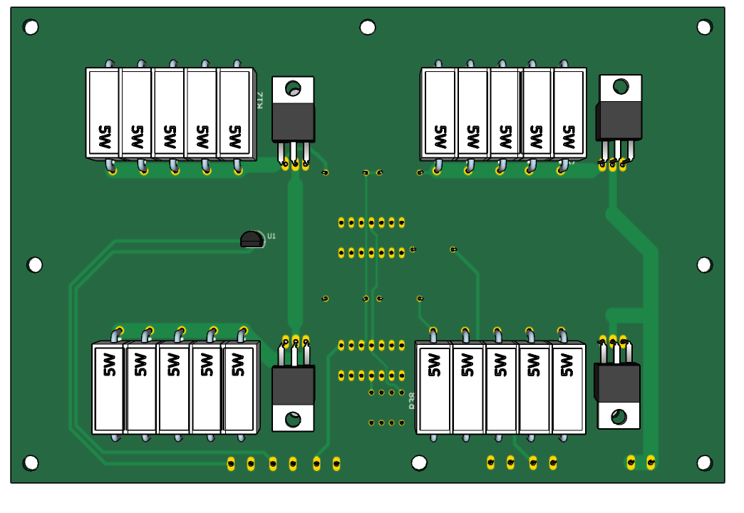 Конструктивно устройство выполнено на 2-х платах - плате управления, где размещены Ардуино Мега, энкодер и кнопки управления и силовой плате, где размещены операционные усилители и силовые транзисторы Q1 - Q4 с 5-ти ваттными керамическими резисторами.