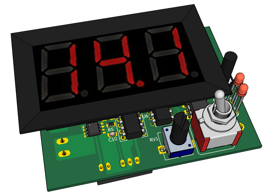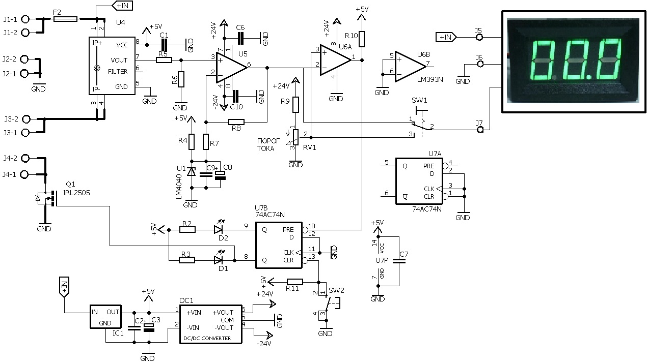 Ток в нагрузке измеряется с помощью датчика тока U4, основанного на эффекте Холла. С выхода датчика напряжение поступает на вход усилителя U5. Резисторы R5,R6,R7,R8 рассчитаны так, что численное значение напряжения на выходе U5 равно численному значение тока в нагрузке. Это позволяет применять для индикации тока в нагрузке и тока срабатывания предохранителя применять дешевый семисегментнный модуль вольтметра постоянного тока.