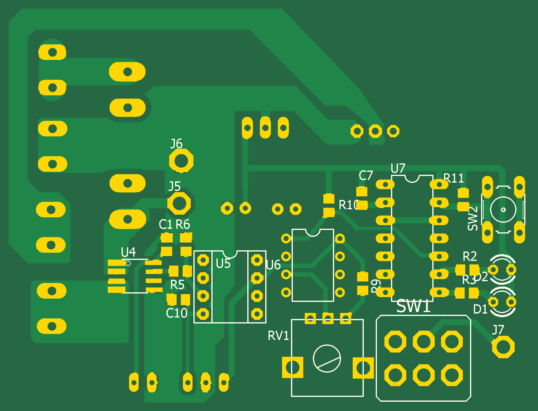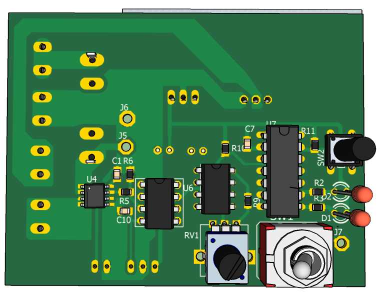 Напряжение с выхода усилителя поступает на отрицательный вход компаратора U6. На положительный вход компаратора поступает пороговое напряжение с потенциометра RV1. Таким образом если ток в нагрузке ревышает предварительно установленное резистором RV1 значение, на выходе компаратора включается лог.0, RS триггер U7 устанавливается в лог.1, на инвертирующем выходе триггера лог.0 и полевой транзистор Q1 запирается, отключая нагрузку. После снятия перегрузки работу предохранителя можно восстановить кнопкой SW2. При входном напряжении 5В стабилизатор напряжения IC1 не устанавливать а его вход и выход необходимо соединить.