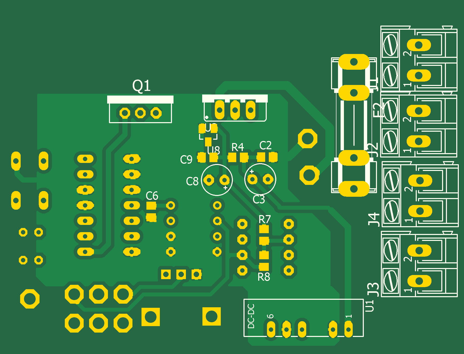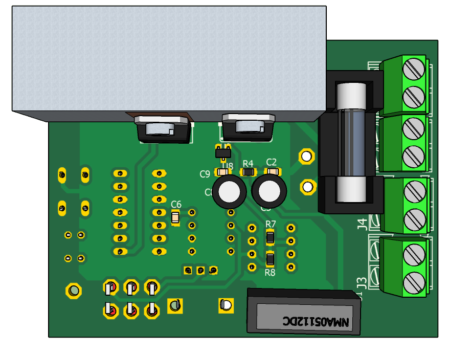 Предназначен для работы в диапазоне 0,5 - 20А в цепи постоянного тока. Диапазон входных напряжений 5 - 30В. Порог срабатывания предохранителя устанавливается переменным резистором. Индикация текущего тока в нагрузке и порога срабатывания осуществляется с помощью семисегментного цифрового модуля.