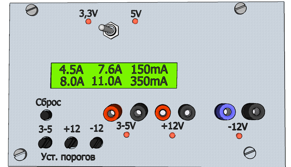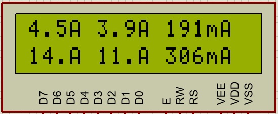 Значения токов в нагрузках отображаются в верхней строке LCD индикатора. Значения установленных порогов - в нижней строке.