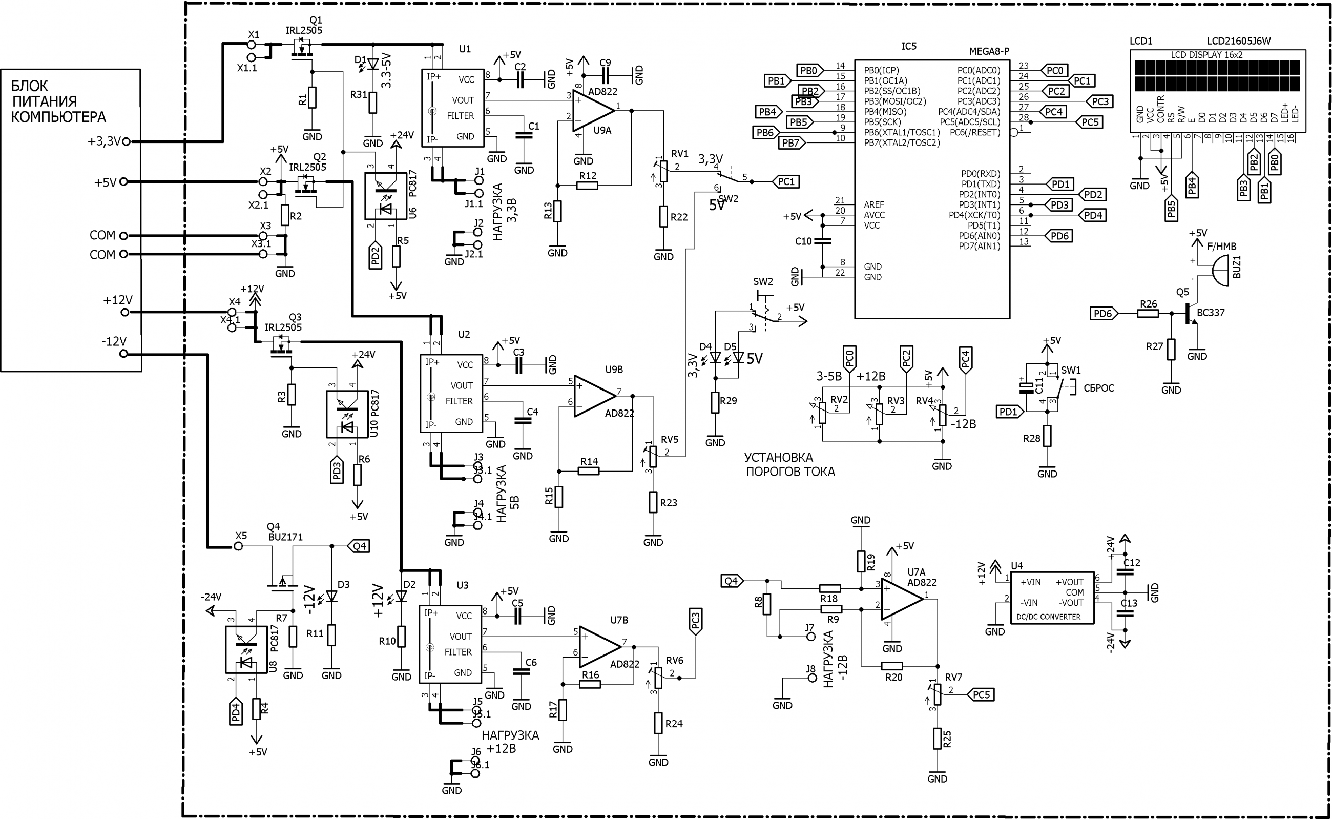 Токи на выходах 3,3В, 5В +12В измеряются датчиками тока U1,U2, U3 и с помощью операционных усилителей U7B и U9 поступают на входы АЦП микропроцессора РС1 и РС3. На выходе -12В ток измеряется с помощью измерительного резистора R8 и через операционный усилитель U7А поступает на вход АЦП РС5. Пороги срабатывания ограничения по току для квждого выхода устанавливаются потенциометрами RV2, RV3, RV4, подключенными к входам АЦП микроконтроллера РС0, РС2, РС3 соответственно.