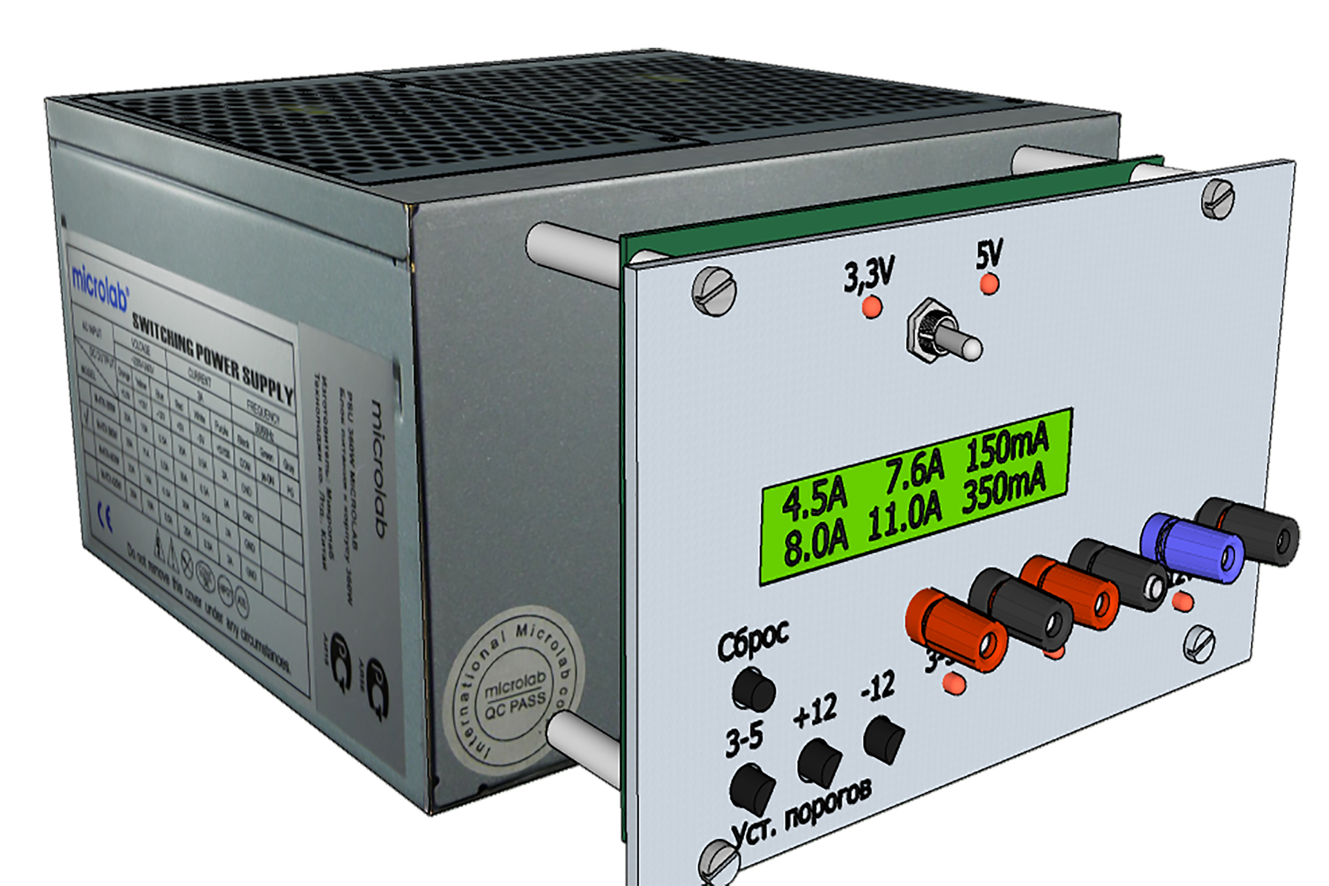 Для применения компьютерного блока питания для лабораторных целей необходимо добавить индикатор и регулируемый порог срабатывания защиты по току на каждом выходе. Это можно сделать на базе микропроцессора Atmega8 с применением 2-х строчного 16-ти символьного LCD индикатора.