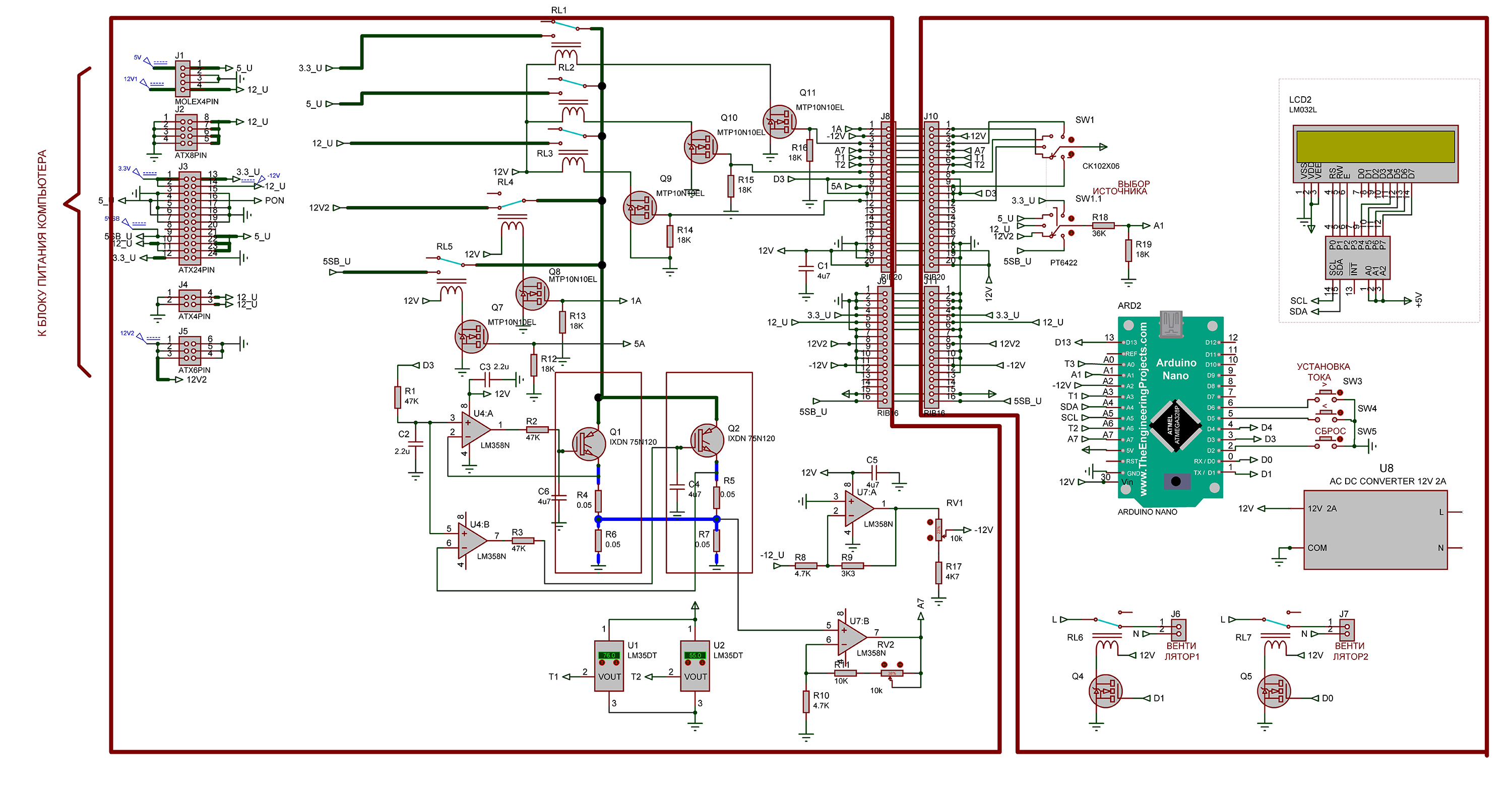 Электронная нагрузка состоит из 2-х IGBT модулей Q1 и Q2, включенных параллельно и работающих в линейном режиме. Эти модули, мощностью по 600Вт каждый управляются операционными усилителями U4A и U4B. На входы усилителей с выхода D3 Ардуино Нано поступает ШИМ сигнал. С помощью RC цепей R1C2, R2C6, и R3C4 этот сигнал преобразуется в аналоговое напряжение. Чем больше ширина импульса, тем выше это напряжение и ток в нагрузке. Напряжение на параллельно включенных резисторах R6,R7 прямо пропорционально току в нагрузке. Оно усиливается операционным усилителем U7B и поступает на аналоговый вход А7 Ардуино. Нагрузка поочередно подключается к источникам компьютерного блока через мощные 120А реле RL1...RL5. Эти реле управляются двухнаправленным 6-ти позиционным круговым переключателем SW1. 2-е направление этого переключателя применяется для последовательного переключения аналогового входа А1 для измерения напряжений компьютерного блока питания. Установка величины тока осуществляется кнопками SW3,SW4. IGBT модули Q1,Q2 измерительные резисторы R4...R7 в корпусах ТО-227 и температурные сенсоры U1,U2 в корпусах ТО-220 размещены на 2-х мощных радиаторах.