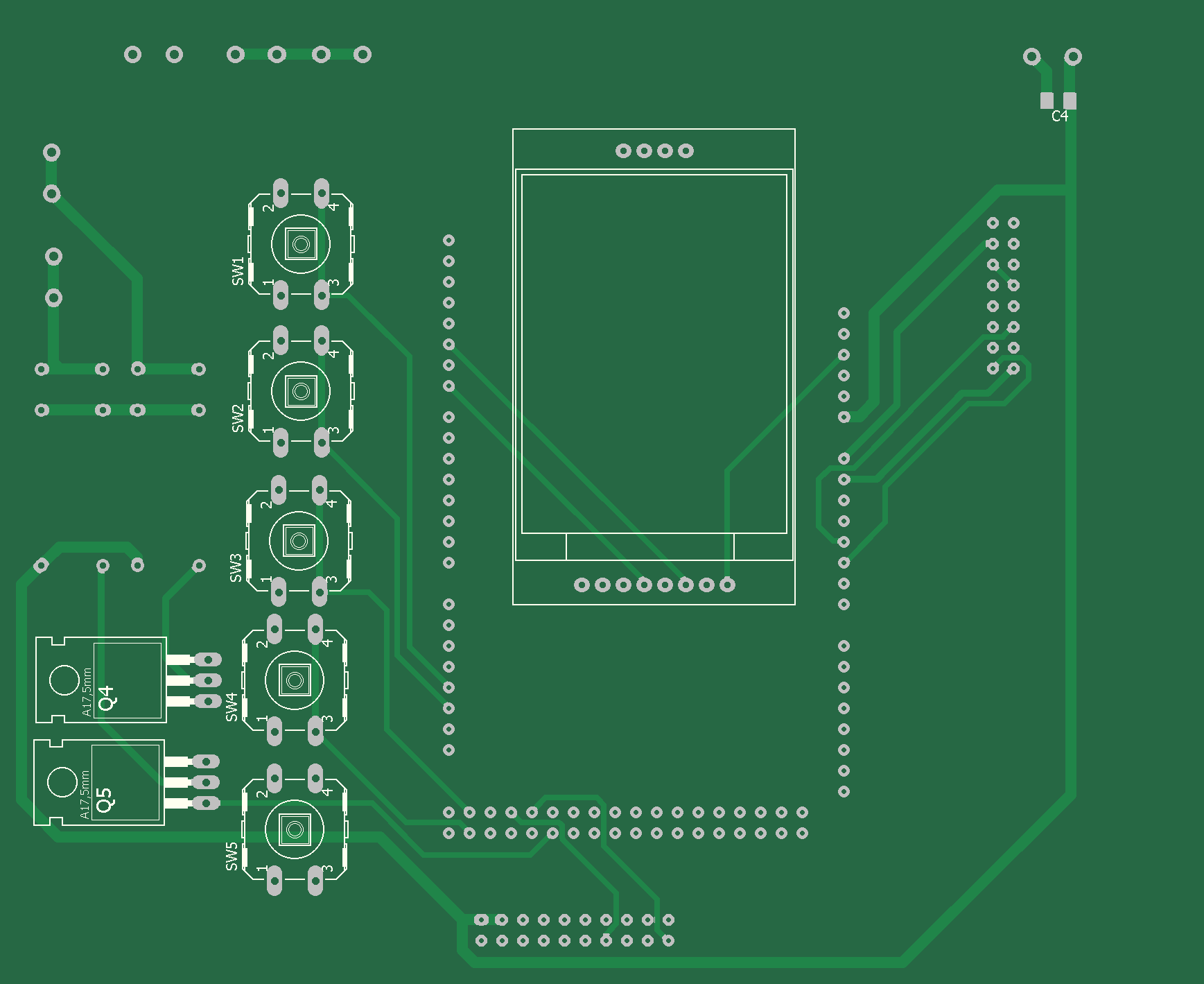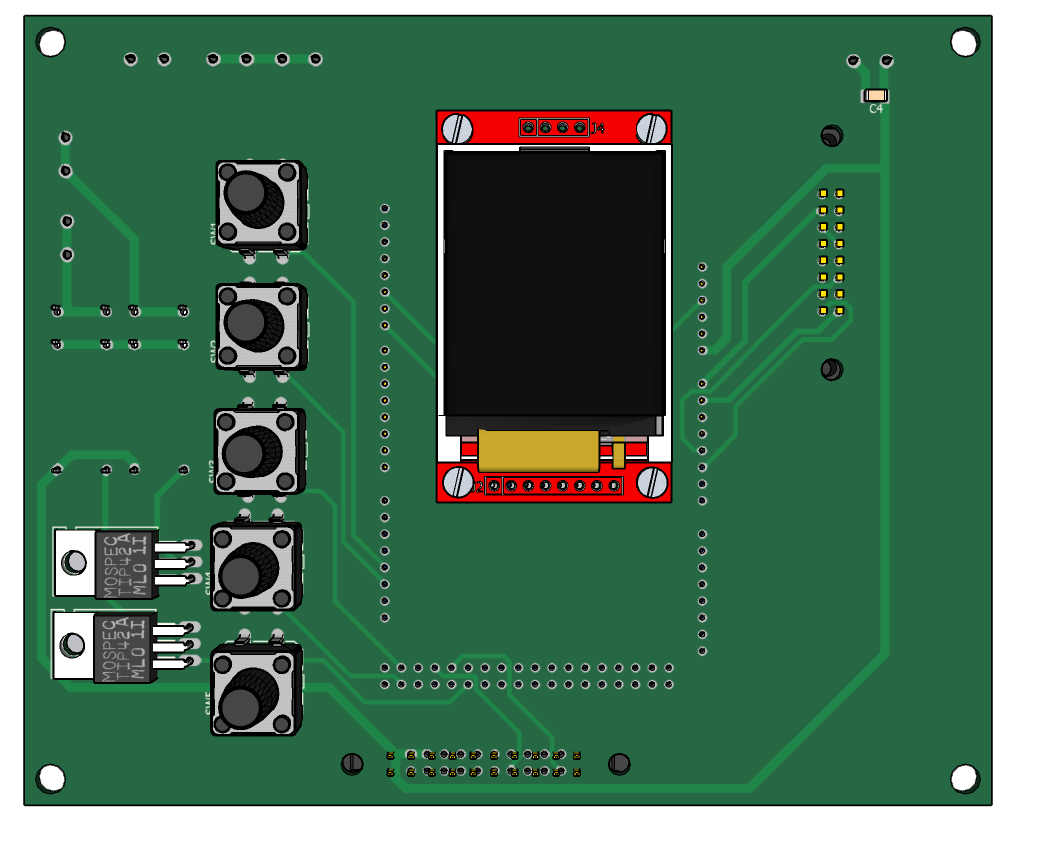 Силовая плата аналогичная вышеуказанной. Плата управления выполена на Ардуино Мега. Выходные напряжения источника подключены к аналоговым входам А0,А1,А2,А3,А4,А5. Реле RL1 включается при лог.1 на выходе РА3, реле RL2 при лог.1 на РА4, реле RL3 при лог.1 на РА5, RL4 при лог.1 РА6 и RL5 при лог.1 РА7. Выбор источника осуществляется кнопками SW3,SW4. Установка величины тока - кнопками SW1,SW2. Управление реле вентиляторов осуществляетс с выходов РС7,РС8. Сигнал ШИМ подключается к входам операционных усилителей U4A,U4B с выхода РЕ4 Ардуино.