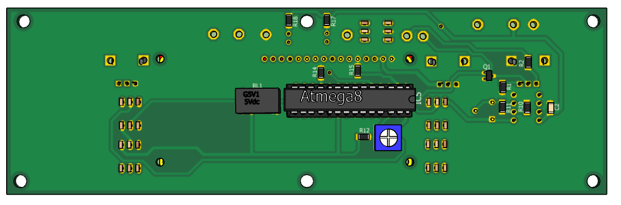 Для измерения температуры мощного транзистора Q4 применяется температурный сенсор U2. При нагреве транзистора до 100 град. на выходе микропроцессора PD7 появляется лог.1, открывается транзистор Q3, срабатывает реле RL1, которое своими контактами включает вентилятор. Когда температура транзистора опускается ниже 70град. то вентилятор отключается. Резисторы R12, R13, RV3 и транзистор Q5 обеспечивают гистерезис при отключении вентилятора. Всё вышеописанное можно посмотреть на видео.
