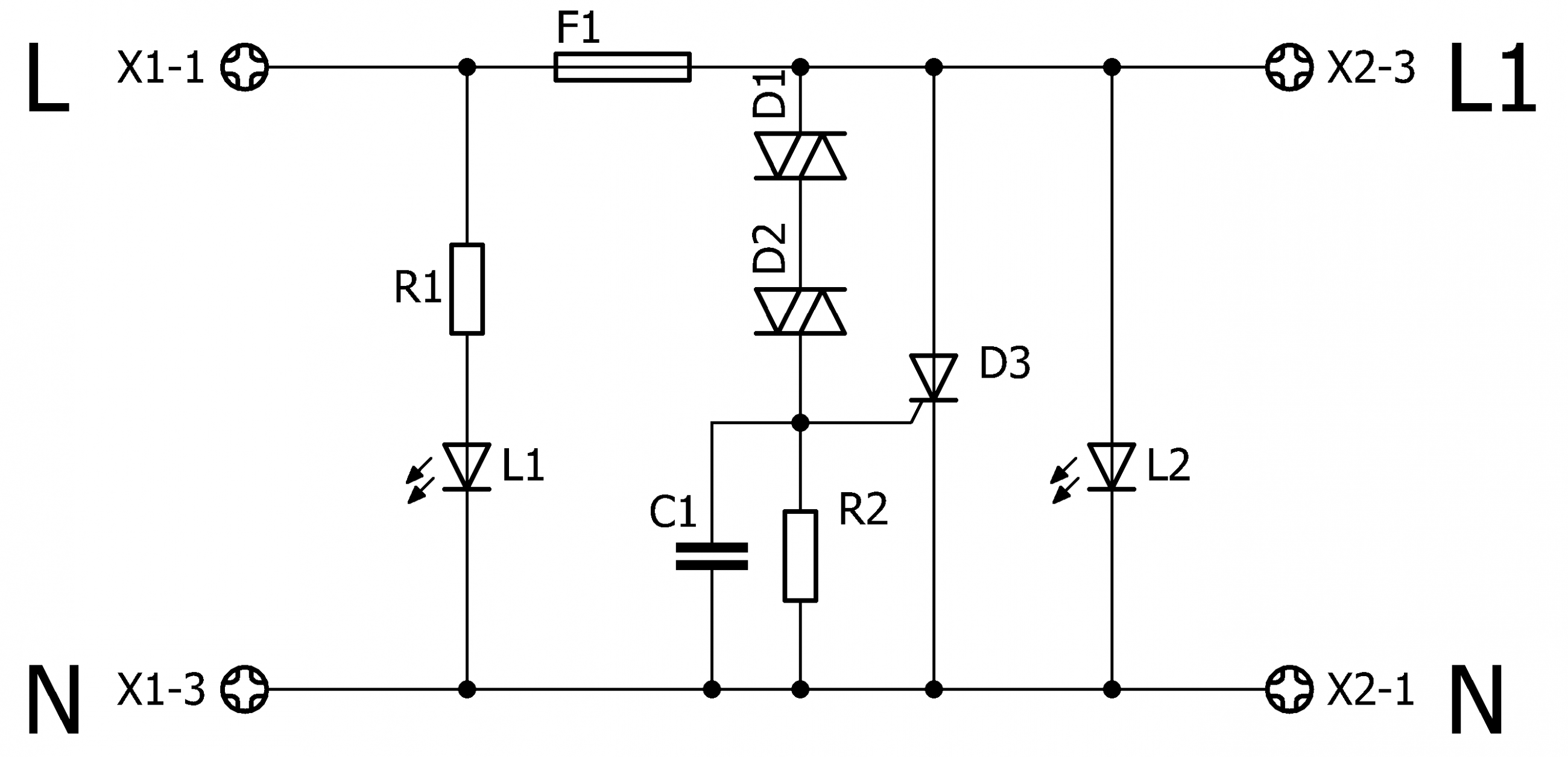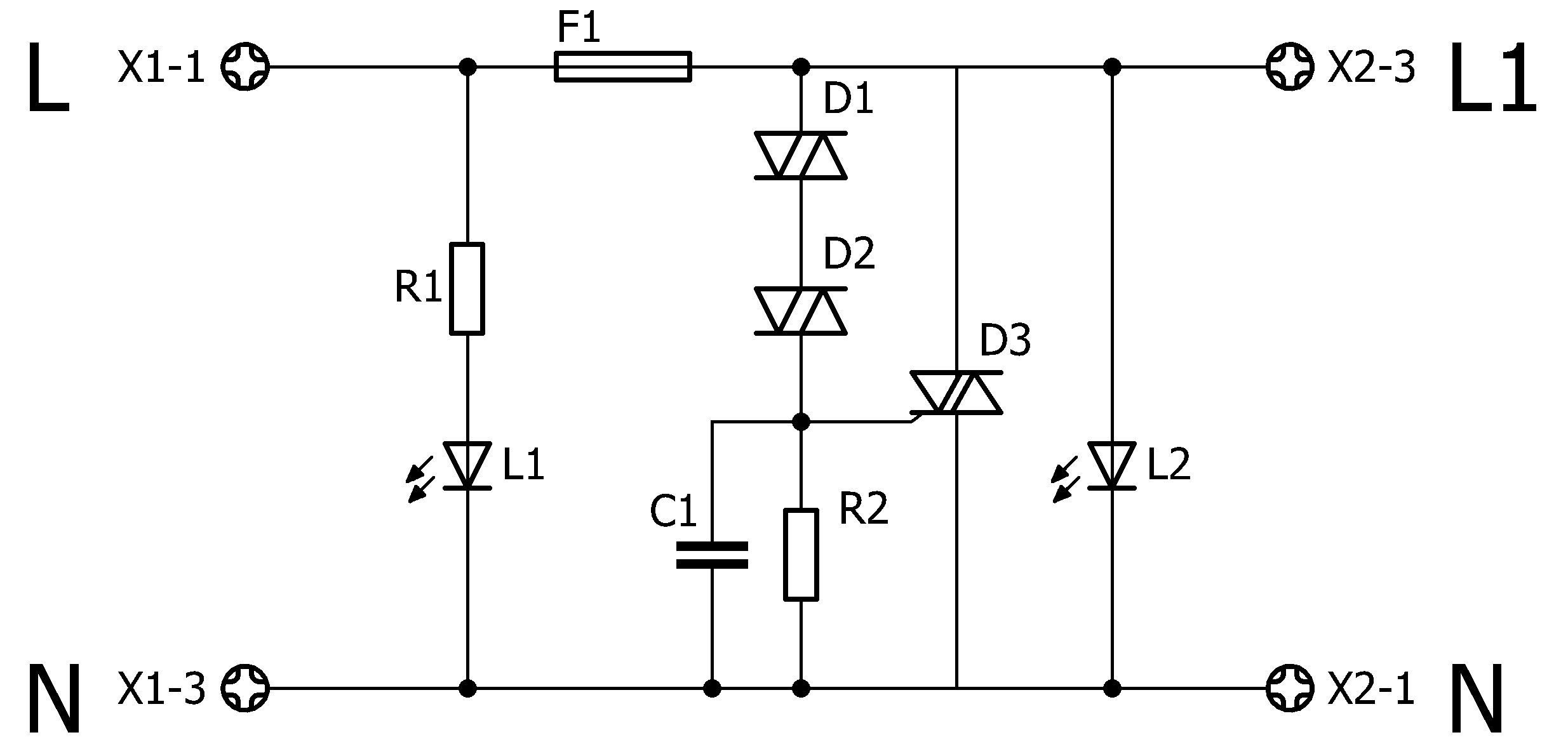 Принцип работы очень простой. Если средневыпрямленное значение перемменного напряжения на динисторах D1,D2 достигает 270В (Vbo на рис. снизу), оба динистора открываются и включается симистор D3. В результате сгорает предохранитель F1 20A и напряжение на клемниках Х2 отключается.