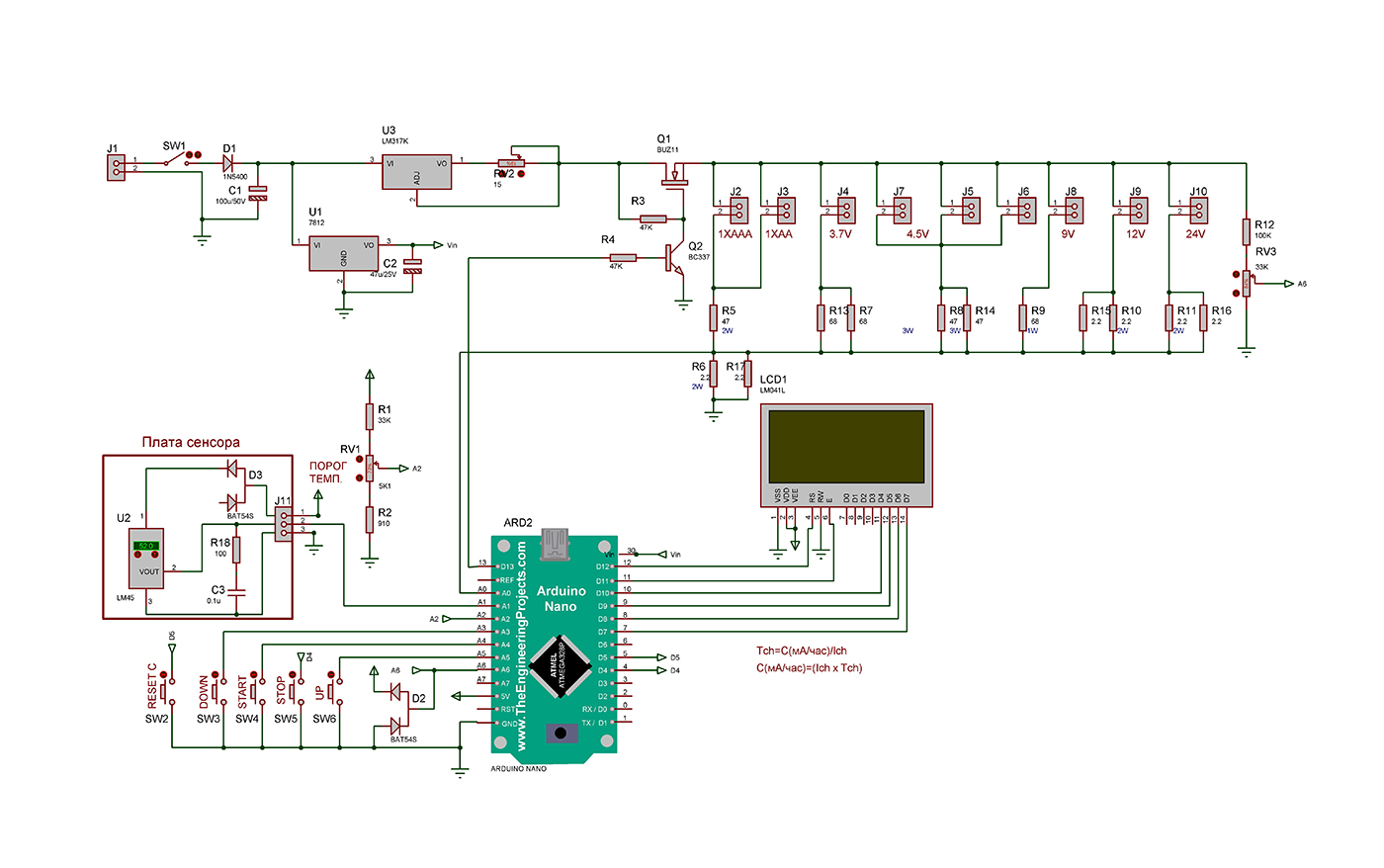 Зарядка осуществляется постоянным током от источника тока на микросхеме U3 LM317. Ток устанавливается переменным резистором RV2. Резисторы R5,R7, R13,R8,R14,R9,R15,R10,R11,R16 ограничивают ток для каждого аккумулятора. Время заряда устанавливается SW6 UP и SW2 DOWN. Зарядка начинается нажатием кнопки START. После нажатия кнопки START необходимо переменным резистором RV2 установить ток заряда и кнопками SW2 и SW6 установить необходимое время заряда. Эти параметры устанавливаются согласно рекомендациям производителей аккумуляторов. Емкость аккумулятора вычисляется по формуле