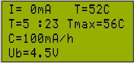 Вторая строка - время до конца зарядки в часах и мин. и максимсально допустимая температура, установленная переменным резистором RV1.