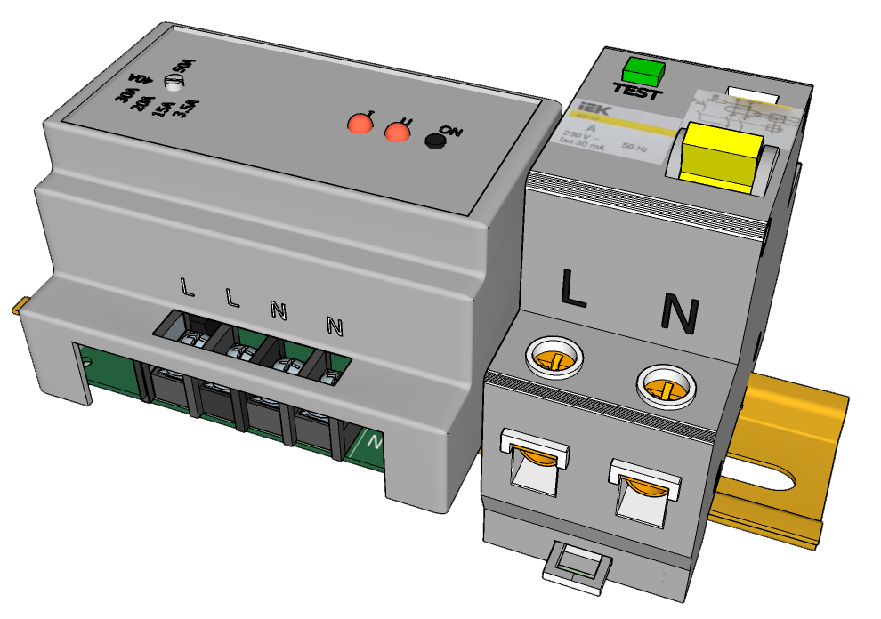 Устройство отключает нагрузку при превышении тока предварительно установленного значения в диапазоне от 3,5 до 50А. Отключение происходит с помощью устройства защитного отключения (УЗО) 63А и током утечки 30мА. Это обусловлено доступностью УЗО. Его можно купить в любом строительном или магазине электротоваров.