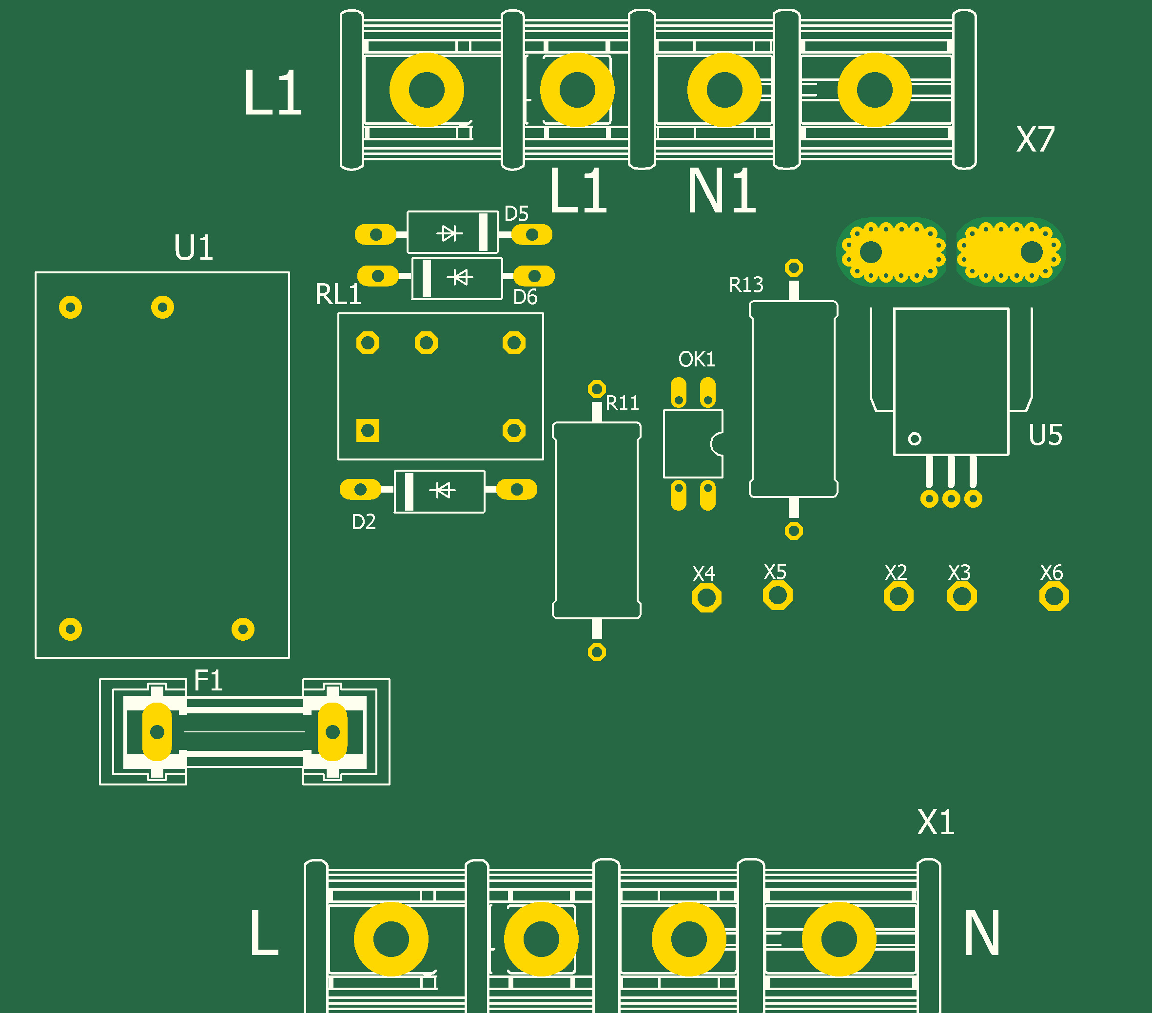 Ток нагрузки измеряется датчиком тока U5, который выдает при максимальном токе 50А напряжение на выходе 5В. Это напряжение поступает на положительный вход компаратора U3. Если оно превышает предварительно установленное пеереключателем значение, на выходе компаратора появляются положительные импульсы, D-триггер U4 устанавливается в лог.1, открывается транзистор Q1 и включается реле RL1. Cвоими контактами оно подключает выход L1 УЗО к нейтрали N через резистор R11 величиной 6К8, тем самым искусственно создавая ток утечки 30мА. В результате УЗО отключает нагрузку от сети переменного тока и включается индикатор D1 ТОК.