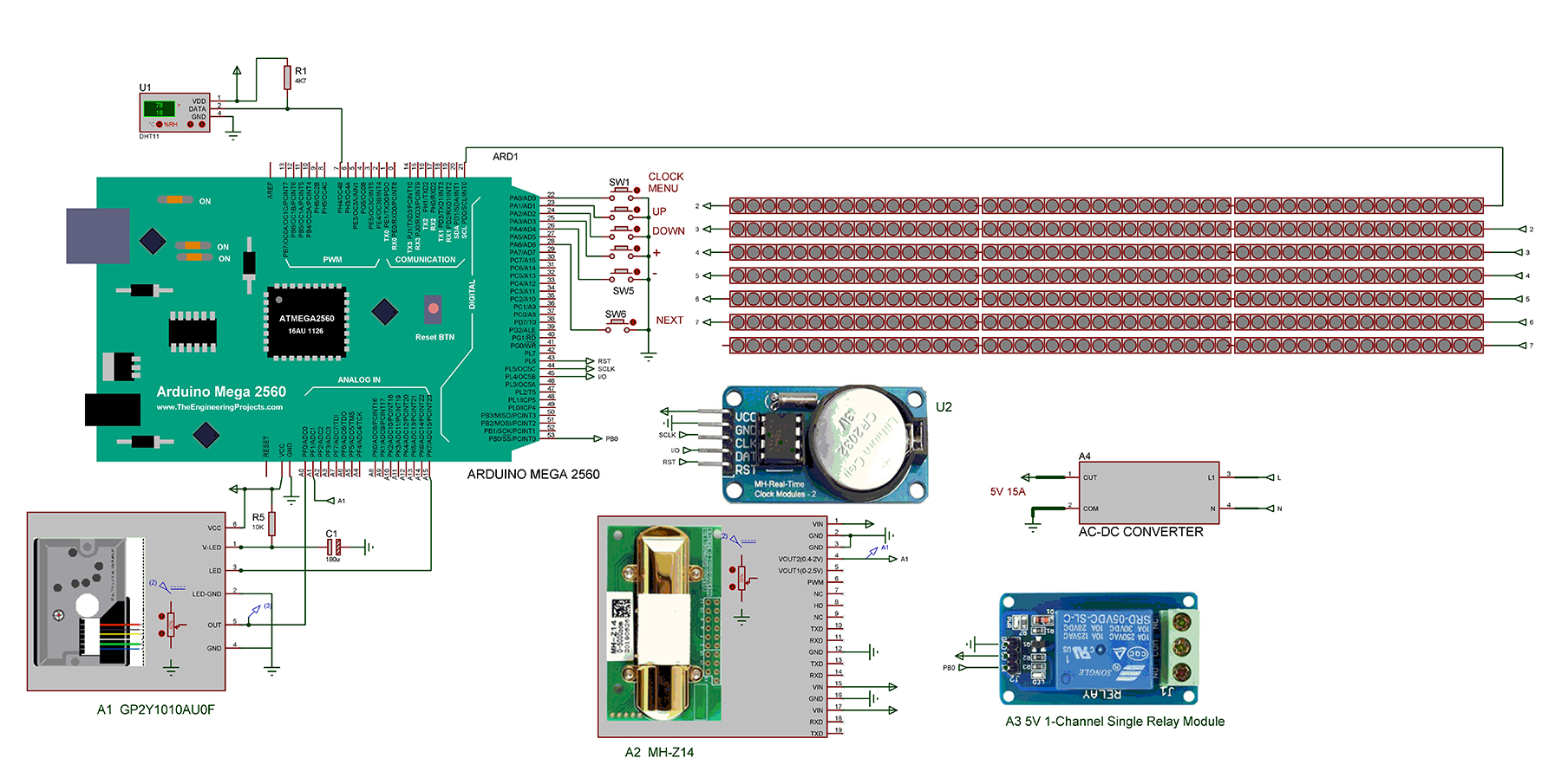 Устройство может быть полезным в небольшом производственном помещении, где находятся много людей. Человек выдыхает в 100 раз больше СО2 чем вдыхает. И в герметично закрытом помещении, тем более, если присутствует много людей, воздух становится удушливым очень быстро. Воздух в закрытом помещении в 4-8 раз грязнее чем на улице, и в 8-10 раз токсичнее. Предлагаемое устройство все это измеряет и показывает. Индикацию обеспечивает семь 48-светодиодных линеек WS2812. Цвет индикатора меняется в зависимости от степени загрязнения воздуха. Когда все в норме - цвет зеленый, если небольшое превышение, цвет голубой, когда загрязнение опасно для здоровья - красный. Переключение индикации в зависимости от измеряемого газа происходит автоматически через каждые 30 сек. или вручную нажатием кнопки SW5. Сердцем служит Ардуино Мега. Схема приведена ниже