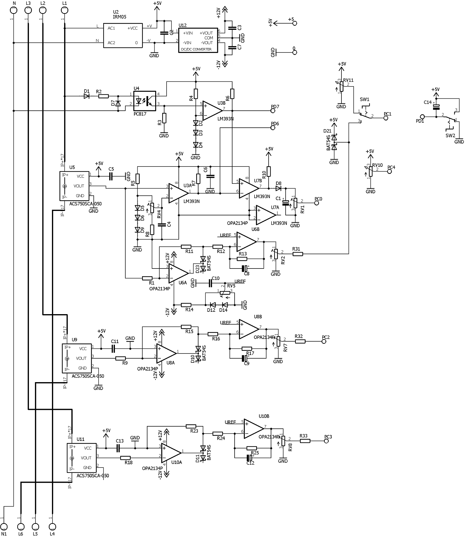 фаз между импульсами тока и напряжения поступает на вход АЦП PC0 микроконтроллера U1. Напряжения, пропорциональные величине тока каждой фазы с выхода трансформаторв тока U5,U9,U11 поступают на входы выпрямителей, состоящих из операционных усилителей U6,U8,U10 c диодами D23,D10,D11 соответственно.