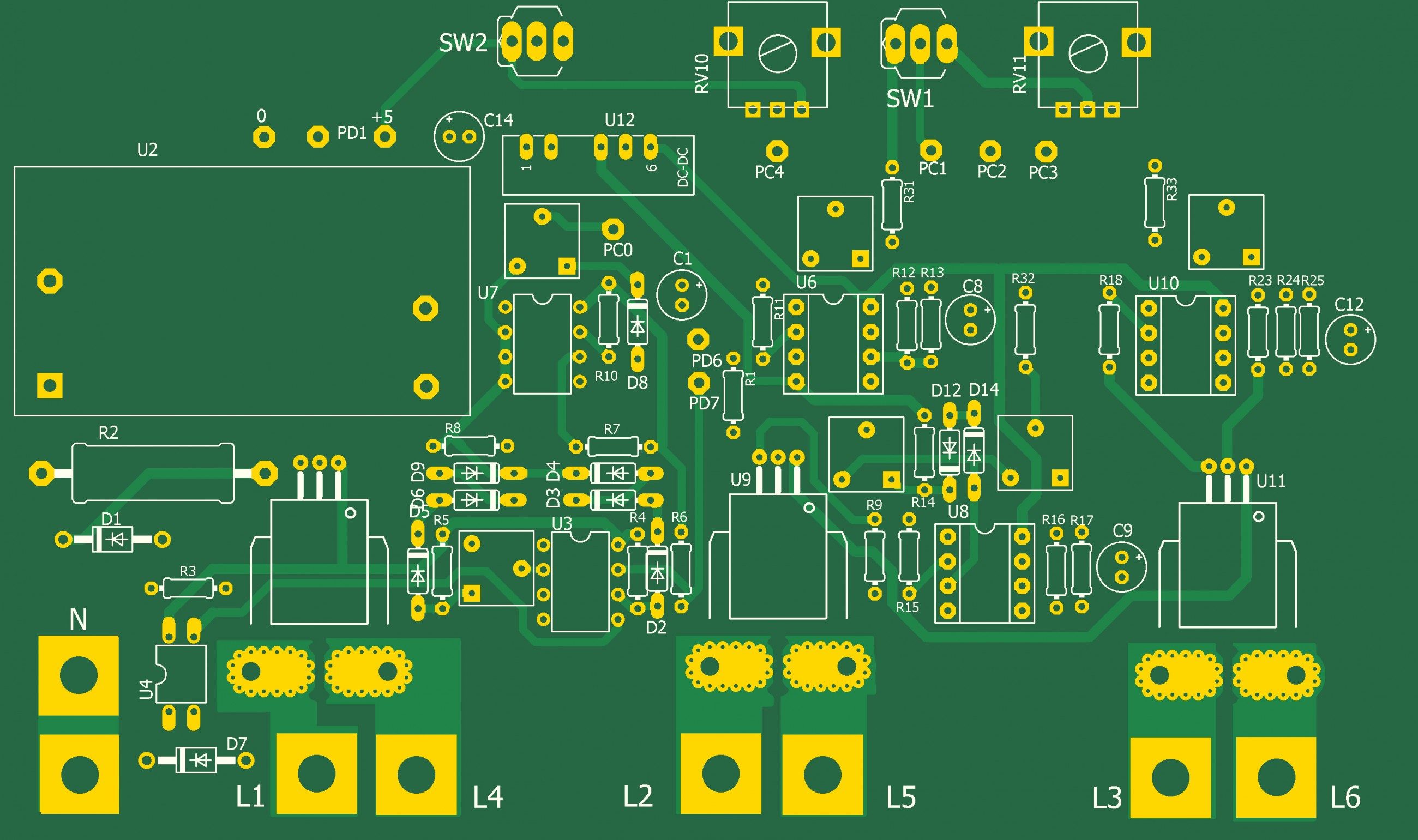 Любое превышение тока фиксируется включением светодиодов D18,D19 или D20.Cветодиоды выключаются нажатием кнопки SW2. Для установки порога срабатывания необходимо переключатель SW1 переключить в положение НАСТР, регулятором RV11 установить по показаниям LCD индикатора необходимое пороговое напряжение и регулятором RW10 включить светодиод D16.