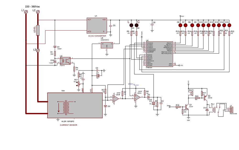 Принцип измерения основан на измерении фазовым компаратором разницы фаз между током и напряжением. Импульс напряжения формируется оптроном U2 и компаратором U3А и поступает на неинвертирующий вход вход фазового дискриминатора U3А. Импульс тока формируется трансформатором тока TR1 и компаратором U3В и поступает на инвертирующий вход вход фазового дискриминатора U3A. Напряжение на выходе фазового дискриминатора пропорциональное разности фаз между импульсами тока и напряжения поступает на вход АЦП PC0 микроконтроллера U4 поступает на вход АЦП РС1. Напряжение, пропорциональное величине тока с выхода трансформатора тока поступает на вход АЦП РС2. При превышении тока более 20А на выходе РС3 появляется лог.1 , включается бузер и реле RL1.Прибор питается от AC-DC конвертера U1 с выходным напряжением 5В.