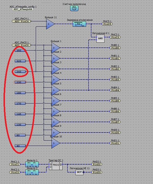 При уменьшениии cos Fi ниже 0,2 светодиоды гаснут. Прошивка разработана в среде HORIZONT CONFIGURATOR. Пороги срабатывания светодиодов можно изменить путем изменения констант как показано на рисунке. Порог срабатывания реле RL1 можно изменить значение константы 260.