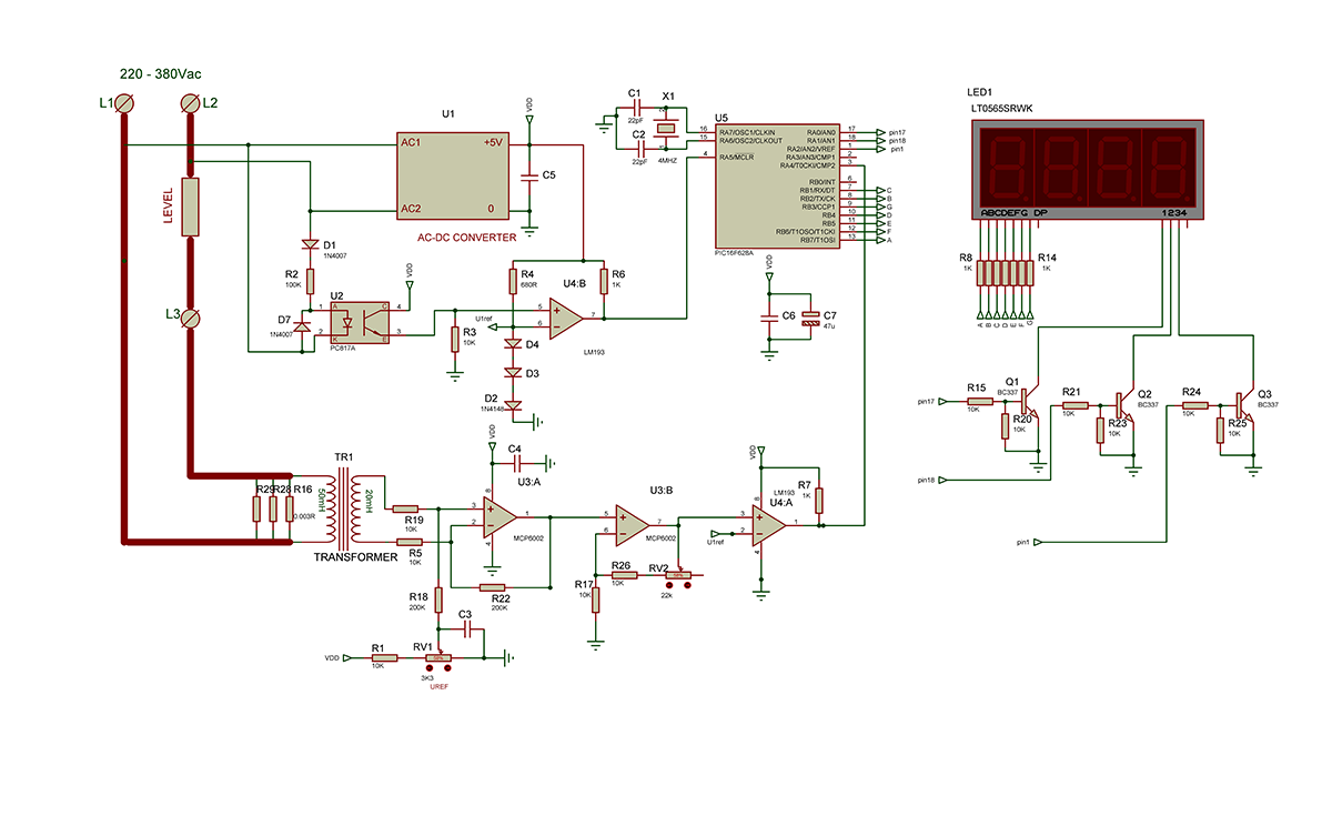 Принцип измерения основан на фиксации моментов появления импульсов напряжения и тока, вычислении разницы в радианах и конвертация в коэффициент мощности. Идея и прошивка заимствована из источника. Доработке подверглась схема формирования импульсов напряжения и тока. Доработка позволила повысить точность формирования импульсов. Импульс напряжения формируется оптроном U2 и компаратором U4B и поступает на вход RA5 микроконтроллера. Импульс тока формируется с помощью трансформатора тока TR1 и компаратора U4А и поступает на вход RA4. Прибор питается от AC-DC конвертера U1.