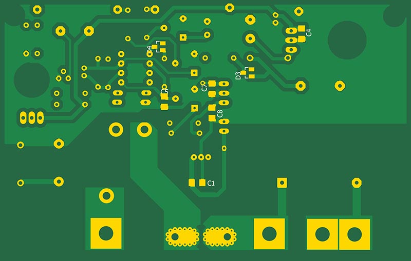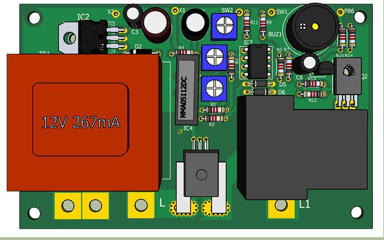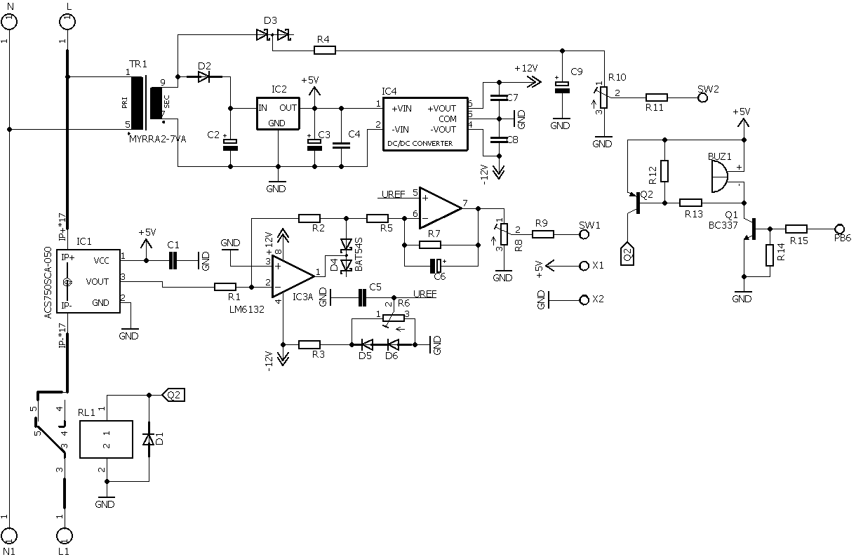 Питание осущетвляется с помщью траннсформатора TR1, выпрямительного диода D2, стабилизатора IC2 с выходным напряжением 5В и DC-DC конвертора с выходными напряжениями ±12В для питания операционного усилителя. Прошивка разработана в среде HORIZONT CONFIGURATOR. Устройство выполено на 2-х платах - плата входная и плата индикации.