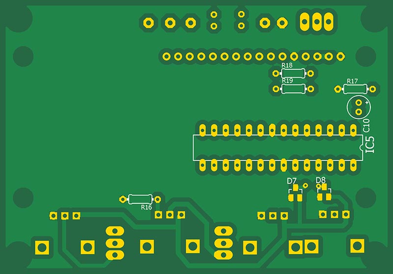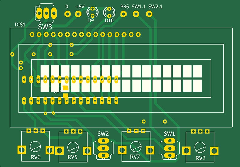 Настроить порог срабатывания защиты по напряжению можно следующим образом. Нажать кнопку SW2. Подстроечным резистором RV7 установить по показаниям LCD индикатора желаемый порог. Затем подстроечником RV6 добиться переключения светодиода D10. Отжать кнопку SW2.