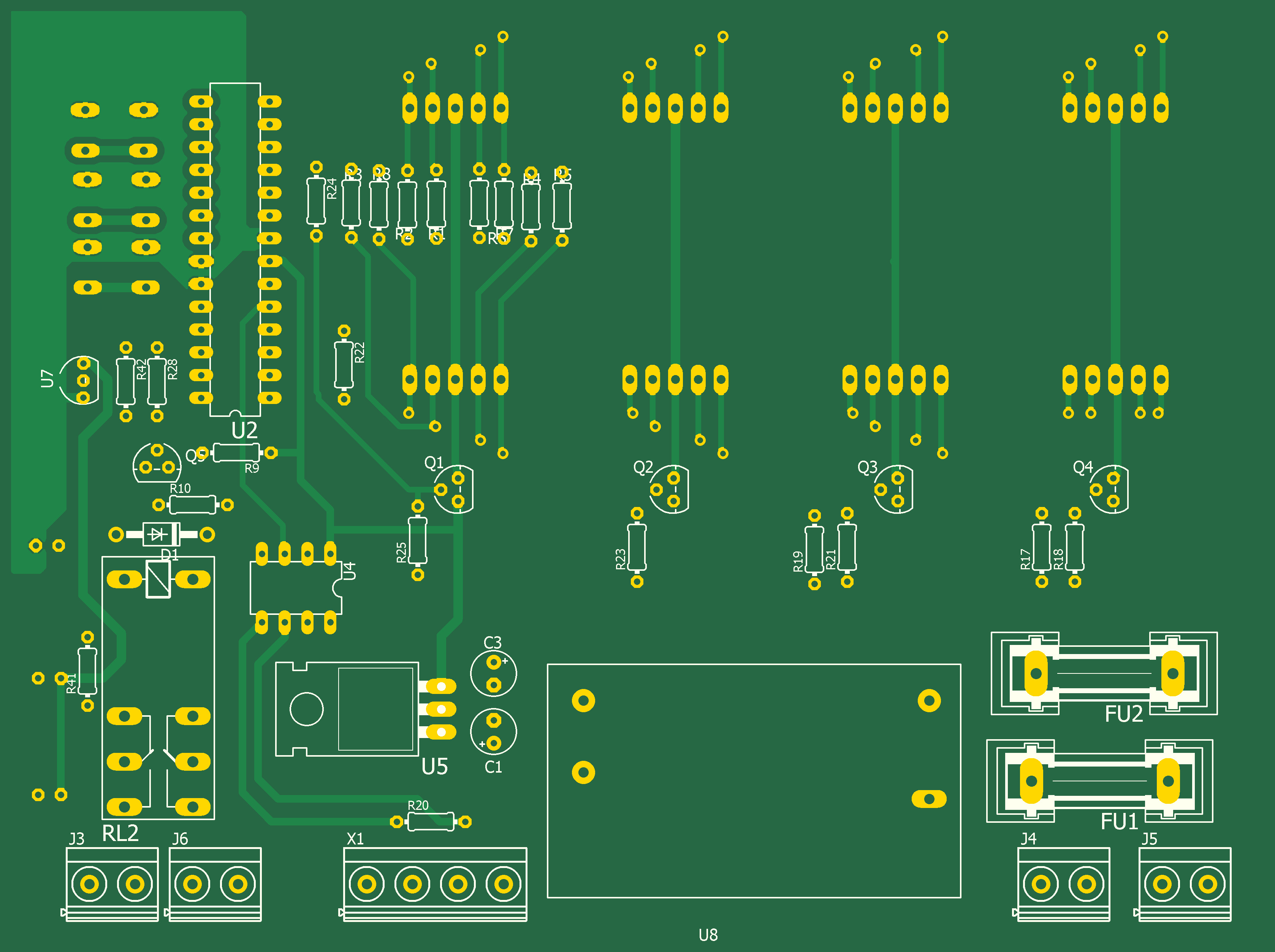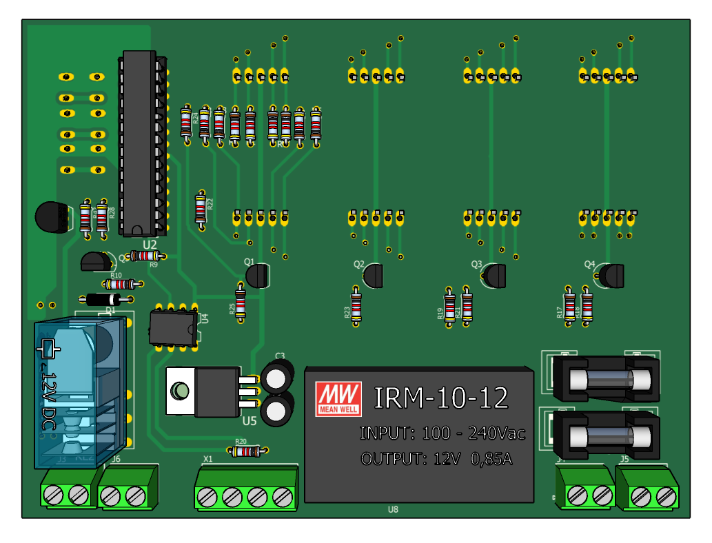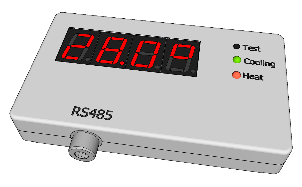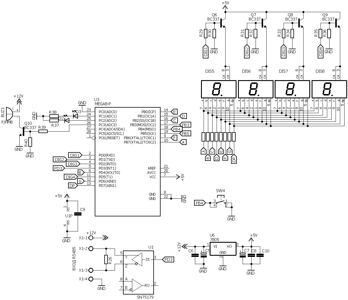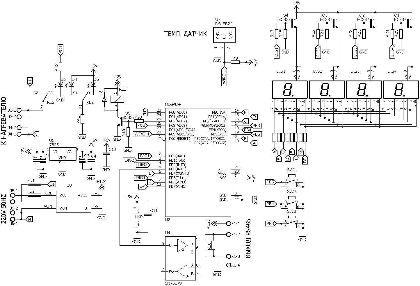 Идея и прошивка найдена на прсторах интернета. Устройство состоит из 2-х блоков - передатчика с температурным сенсором и приёмника. В оригинале связь между передатчиком и приемником осуществляется по радио. В данной статье предлохена двухпроводная связь через интерфейс RS485. Кроме того к анодам семисегментных индикаторов добавлены транзисторы Q1 - Q4, Q6 - Q9, что позволяет использовать более мощные индикаторы, на плате передатчика установлены блок питания и реле для включения нагревателя термостата.