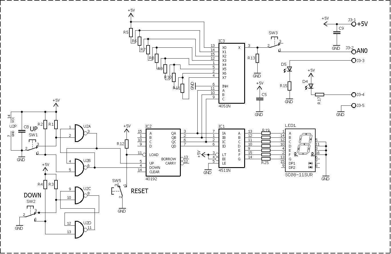 Набор числа производится с помощью кнопок SW1 и SW2. Во избежании влияния дребезга контактов кнопки подключены ко входам Up Down двоичного счетчика IC2 через RS- триггеры U2. Двоичный код с выхода IC2 поступает на семисегментый индикатор LED1, который служит для индикации установленного числа и на счетчик аналогового мультиплексора IC3, который переключает резисторы R5 - R11. Выход мультиплексора подключен к аналоговому входу микроконтроллера. Таким образом каждому установленному числу соответствует свое значение напряжения. Все эти значения записываются при програмировании в микроконтроллер, после чего он реагирует только на них.