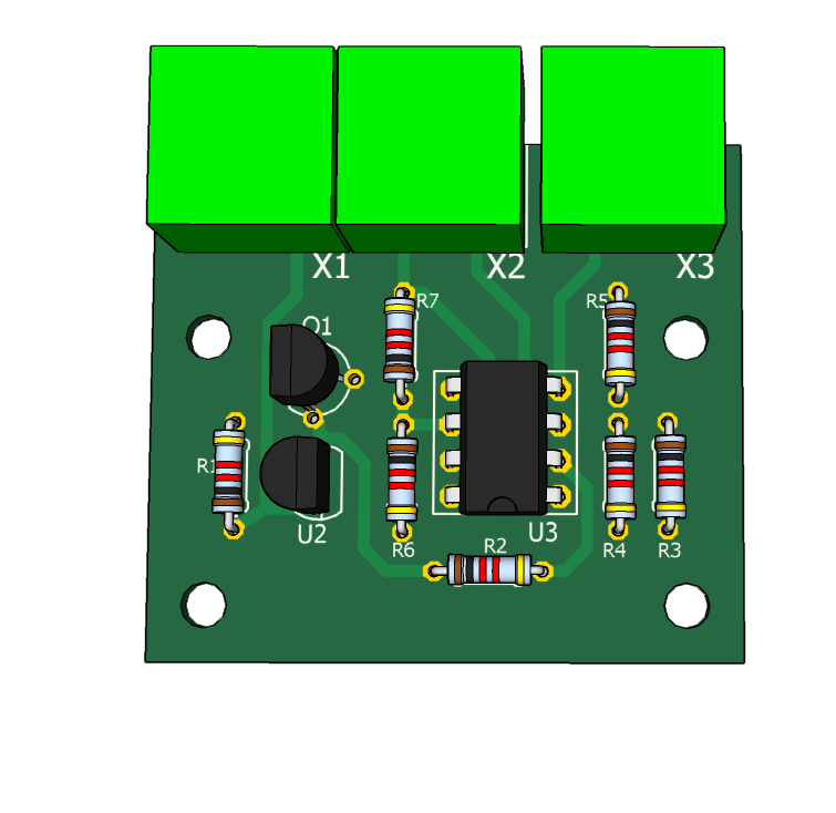 Датчик температуры LM35 включен с подпоркой на транзисторе Q1. При температуре 0 °C на выходе усилителя U3 напряжение 0В. При температуре -40 °C на выходе -4В, при +120 °C напряжение +12В. Выносная плата подключается к термостату с помощью экранированного кабеля с витой парой. Это позволяет подавлять синфазные помехи. Длина кабеля до 8-ми метров. Схема работает аналогично предыдущей, с той разнице, что для индикации отрицательных температур применяются диодный мпст на диодах Шоттки D1 - D4 , для индикации порогов вулючения и выелючения нагревателя - диодный мпст на диодах Шоттки D5 - D8. Питание с помощью AC DC конвертера IRM-05-15 с выыходным напряжением 15В и током 300мА.