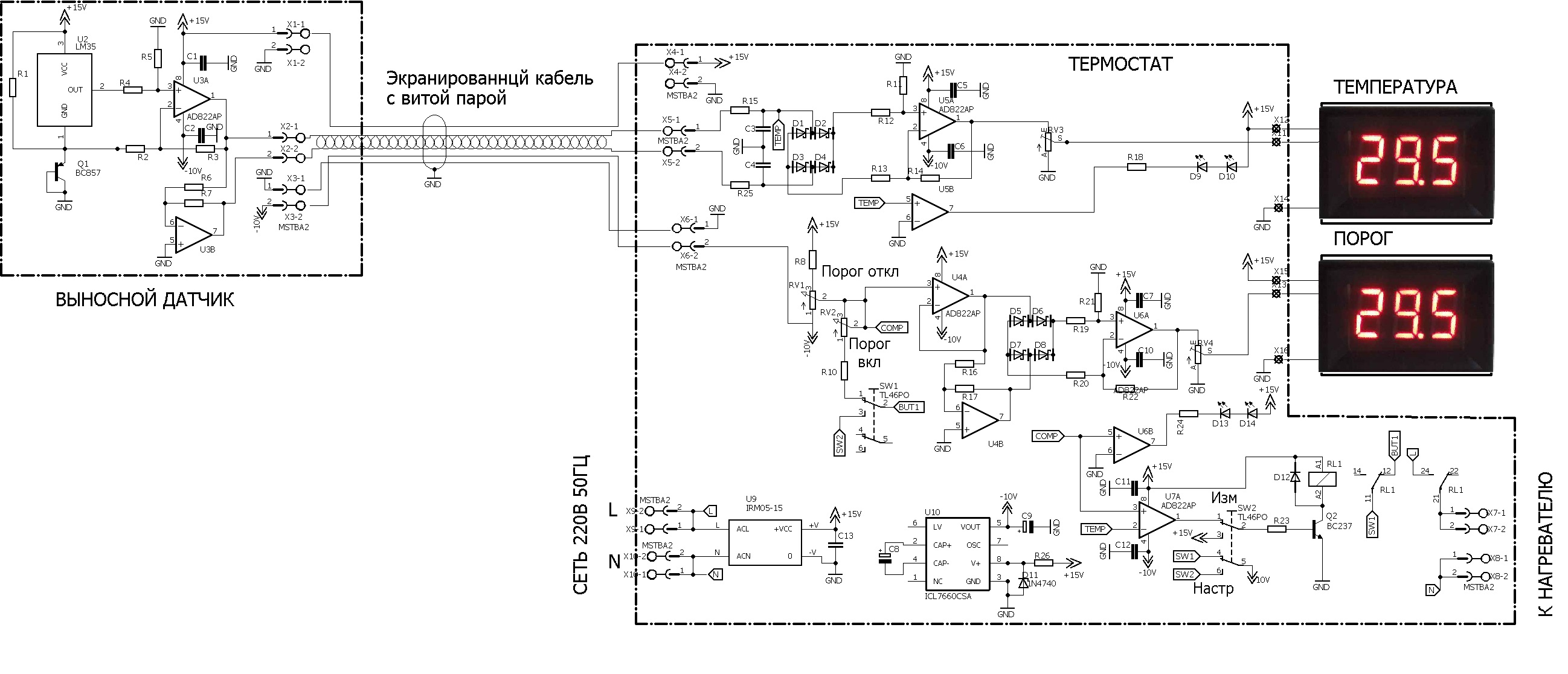 Ниже приведена схема термостата, работающего в диапазоне температур от -40 до +140 °C.
