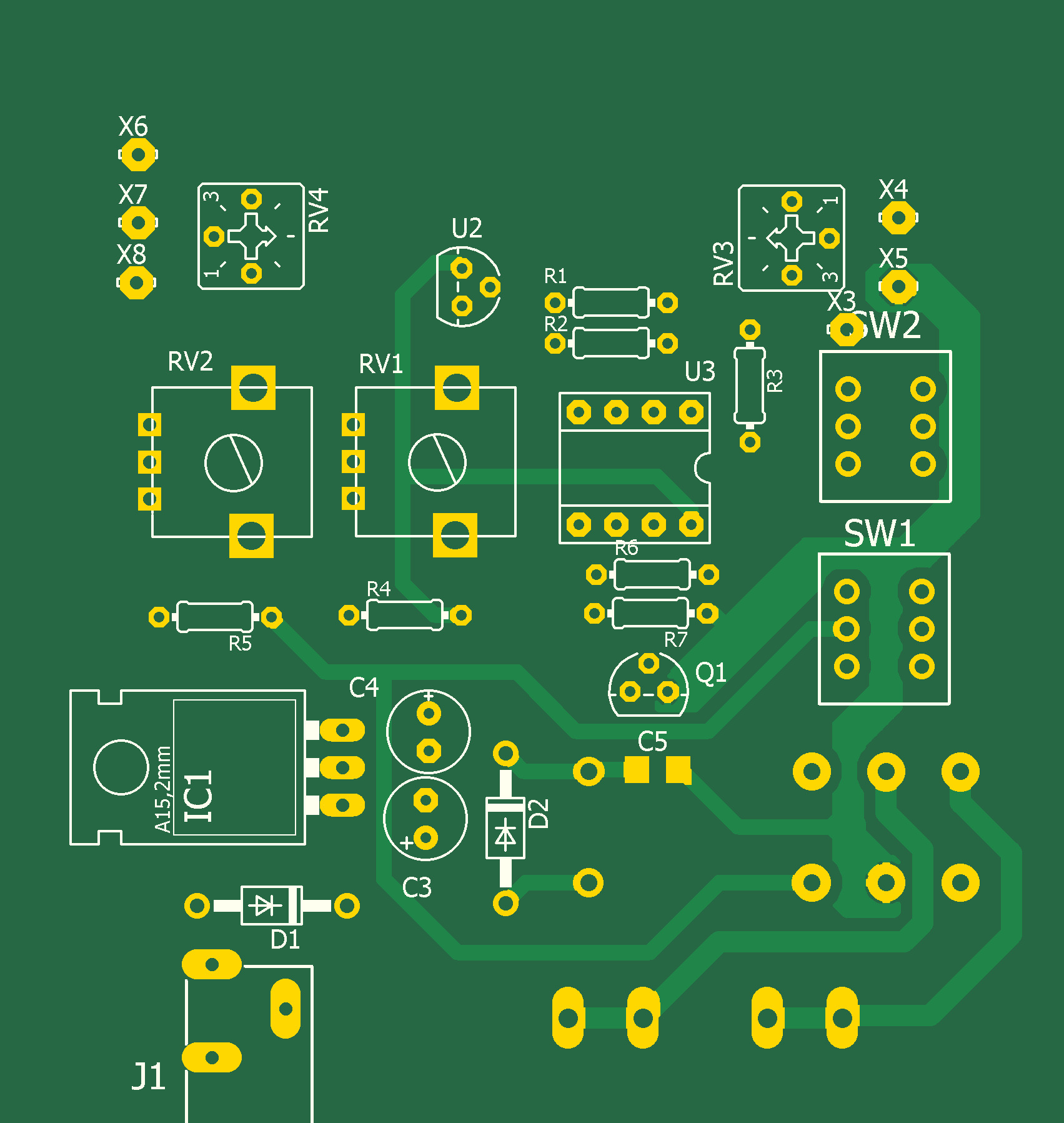 Для настройки термостата с помощью подстроечного резистора RV3 установить показания 7-ми сегментного модуля индикатора температуры соответственно показаниям образцового термометра. Затем измерить напряжение на среднем выводе переменного резистора RV1 и подстроечным резистором RV4 установить соответствующее показание на индикаторе порога.