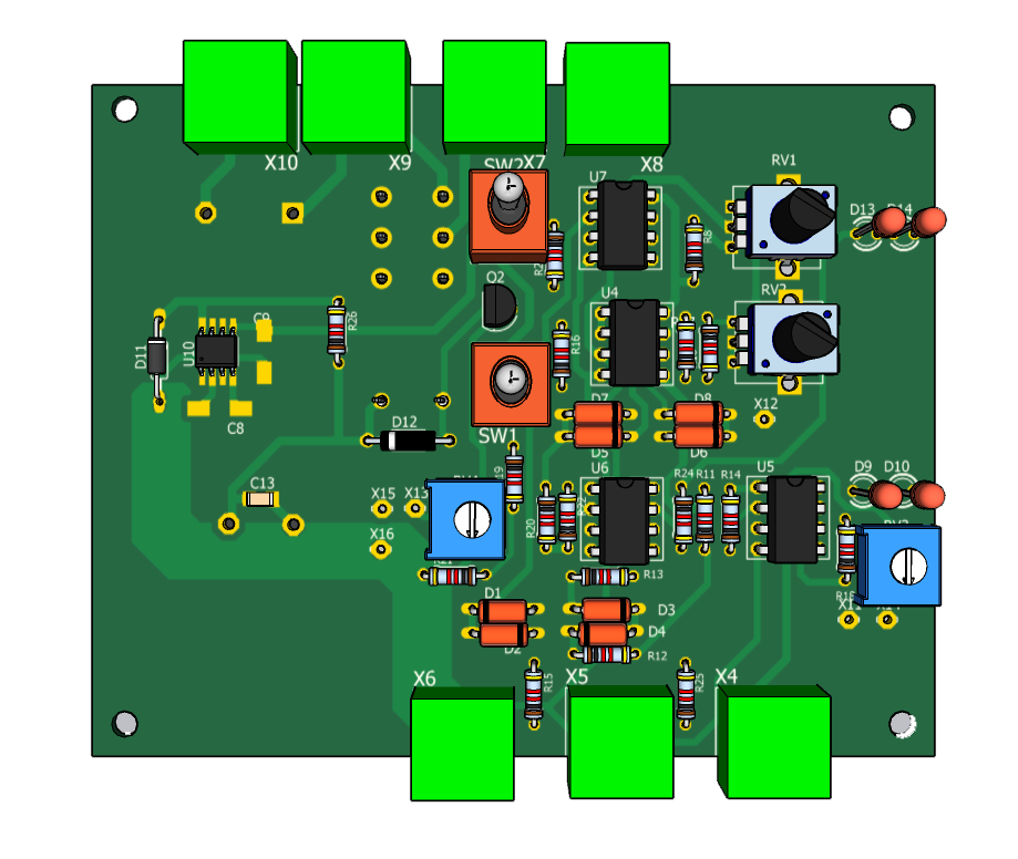 Выносная плата подключается к термостату с помощью экранированного кабеля с витой парой. Это по зволяет подавлять синфазные помехи. Длина кабеля до 8-ми метров. При температурах от -40 до 0 °C напряжение на выходе выносной платы -4В - 0В, при температупах 0 - 140 °C от 0 до 14В . Схема работает аналогично предыдущей, с той разнице, что для индикации отрицательных температур применяются диодный мпст на диодах Шоттки D1 - D4 , для индикации порогов вулючения и выелючения нагревателя - диодный мпст на диодах Шоттки D5 - D8. При отрицательных температурах включаются сетодиодц D9, D10 и D13,D14 Питание с помощью AC DC конвертера IRM-05-15 с выыходным напряжением 15В и током 300мА.