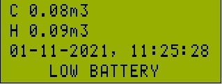 В первой и второй строке показания счетчиков холодной и горячей воды, в третьей строке - дата и время. Для установки даты и времени нажав кнопку SW12 войти в меню. В третьей строке появится пункт меню YER