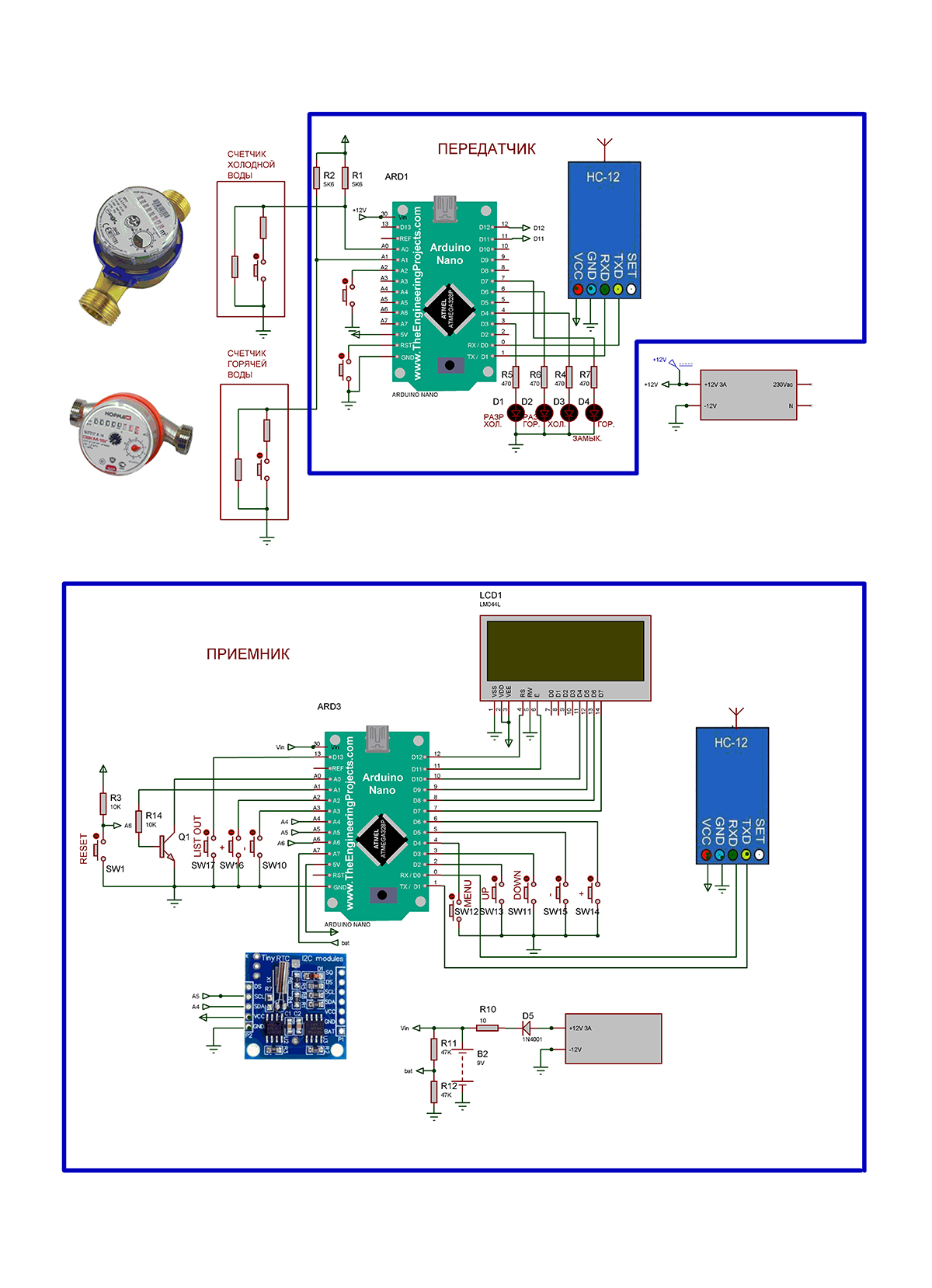 Связь между передатчиком и приемником с помощью радиомодулей НС-12. Импульсные выходы счетчиков горячей и холодной воды подключены к аналоговым входам А0 и А1 Адуино ARD1. Такая схема подключения позволяет определить обрыв или замыкание выходов счетчиков. Состояние выходов отображается с помощью светодиодов D1 - D4.