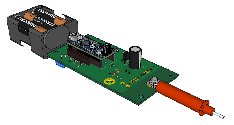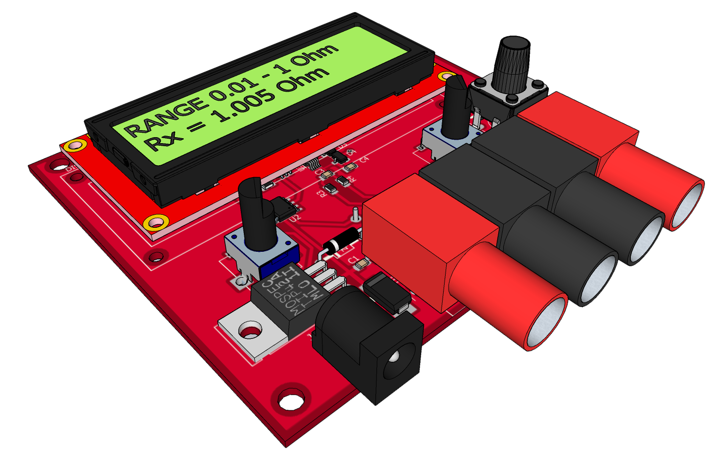 Устройство позволяет измерять сопротивления от 0.01 до 20 Ом. Для измерения применены 4-х проводные зажимы Кельвина