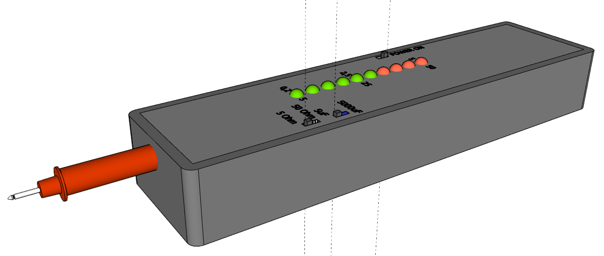Генератор реализован на микросхеме U1. Частота генератора определяется значениями R1 C1. Напряжение с выхода генератора через лелитель-ограничитель C2,R2,D1,R3,R4,C3 поступает на проверяемый конденсатор Сх. Далее через диодный ограничитель D2 предназначенный для защиты усилителя напряжение усиливается и выпрямляется активным детектором на операционном усилителе U2A с переключаемым усилением и сглаживается интегратором на U2B. Выпрямленное постоянное напряжение, величиной от 0,5 до 10В в зависимости от величины ЭПС, поступает нв вход микросхемы U3 LM3914, которая является драйвером линейки светодиодов D5-D14. При ЭПС 0,2 Ом включается один светодиод D5. По мере увеличения ЭПС количество включенных светодиодов увеличивается. При ЭПС 5 Ом и положении переключателя 0,2 - 5 Ом включаются все 10 светодиодов. При ЭПС 50 Ом и положении переключателя 5 - 50 Ом включаются также все светодиоды.