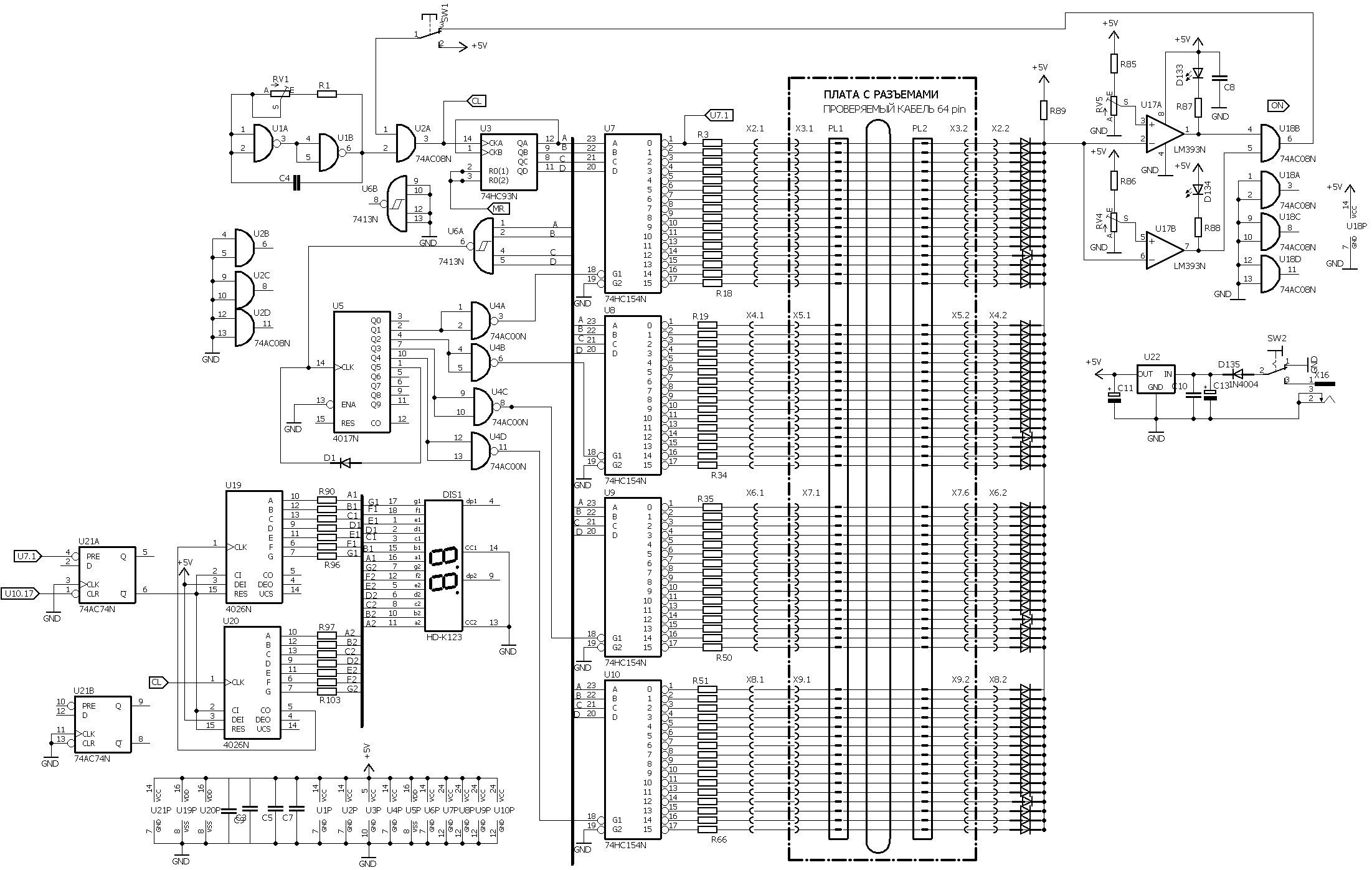 Принцип действия заключается в том, что дешифраторы U7 - U10 переключают выходы, подключенные к проводам проверяемого плоского кабеля с 0 до 64. Эти выходы через проверяемые провода и развязывающие диоды подключены к резистору R89 и образуют делитель напряжения, к выходу которого подключены компараторы U17A, U17B. Когда все провода исправны, на входах компараторов 2,8В, на выходах лог. 1. При этом импульсы с выхода тактового генератора U1 поступают на счетчик U3. Выходы дешифраторов переключаются до 64 и счет останавливается.