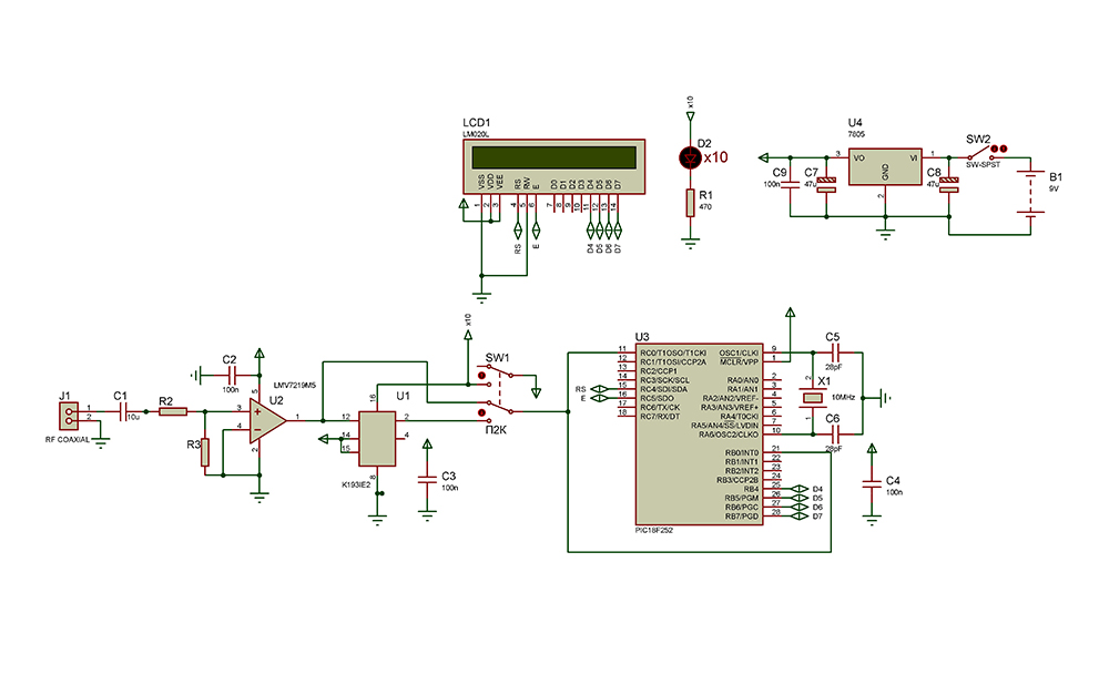 Если частота сигнала меньше 10МГц, то выключатель SW1 находится в верхнем положении и сигнал с выхода формирователя на компараторе U2 поступает прямо на измерительный вход микропроцессора RC0, если частота выше 10МГц, переключатель SW1 необходимо переключить в нижнее положение и сигнал поступает на вход микропроцессора через делитель на 10 U1.
