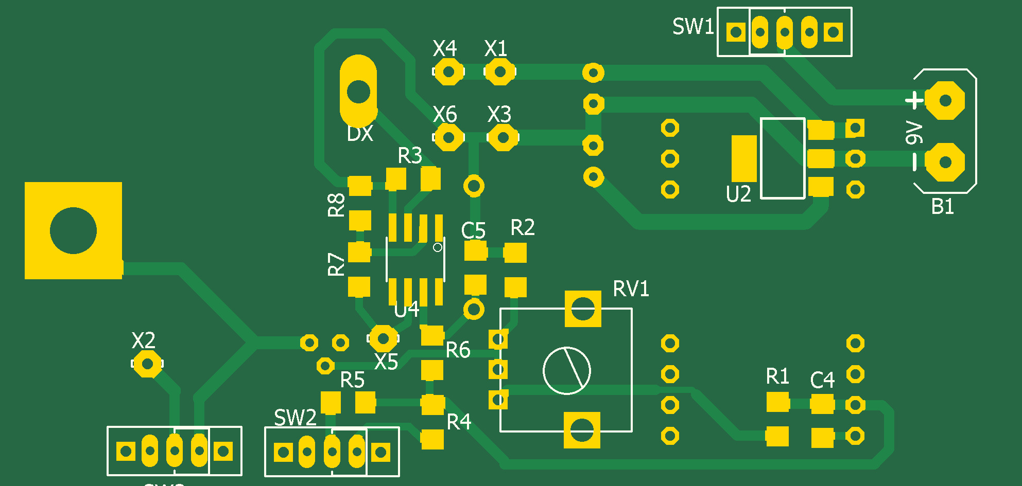 Источник тока с проверяемым стабилитроном подключены к модулю DC-DC конвертера U3 с выходным напряжением 48В и с вхолным напряжением 5В. Питается устройство от аккумулятора 9В. Переключив переключатель SW3 в положение BAT можно проверить напряжение аккумулятора.