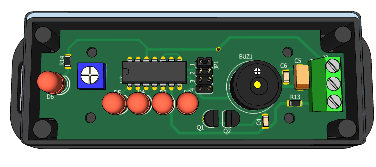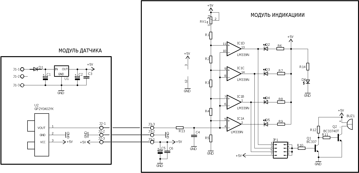 Выходное напряжение инфракрасного датчика поступает через цепь R13,C4 на вход счетверенного компаратора IC1. При расстоянии до препятствия 140см включается светодиод D5, при расстоянии 80см включаются D5,D4, при расстоянии 45см - D5,D4,D3. При достижении расстояния до препятствия 30см включаются все светодиоды. Пороги срабатывания светодиодов D2-D5 можно подстроить триммером RV1. Порог срабатывания зуммера устанавливается джампером JP1.