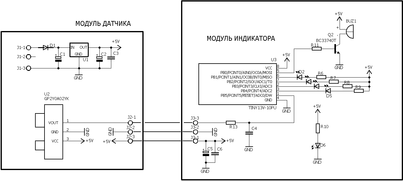 Ниже на рис.1 приведена схема простого парковочного радара. Здесь в качестве сенсора применяется инфракрасный сенсор GP2Y0A02YK.