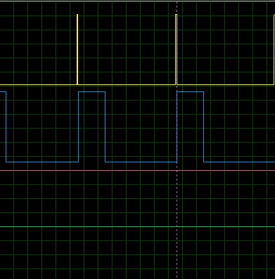 Здесь желтый цвет - импульсы TRIG на выходе генератора U2, синий цвет - импульсы ECHO на выходен сонара U3.