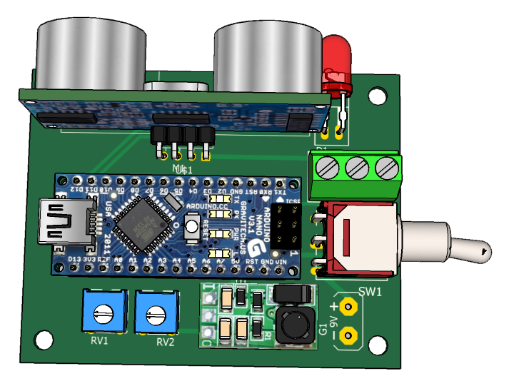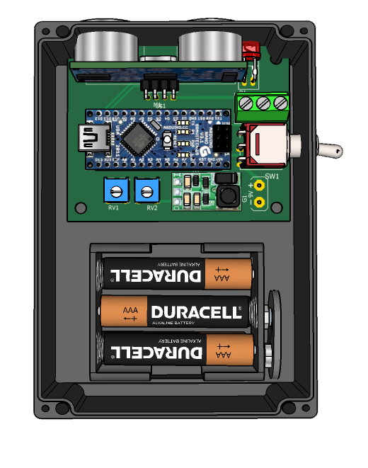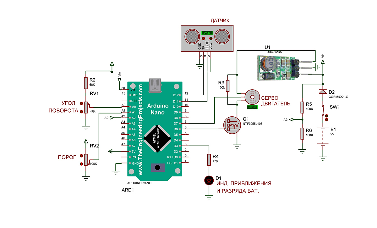 Устройство выполнено на Ардуино Нано. В качестве датчика расстояния применен ультразвуковой датчик HC-SR04. При приближении к контейнеру на расстояние, установленное потенциометром RV2 на выходе D6 появляется лог.1 , транзистор Q1 открывается и через 2сек. серводвигатель SG-5010 приводит в движение крышку котейнера и он открывается. При этом включается светодиод D1. После удаления от контейнера крышка автоматически закрывается. Угол открывания крышки регулируется потенциометром RV1. Транзистор Q1 применяется для того, чтобы когда крышка закрыта сервомотор отключался от питания с целью экономии заряда аккумулятора. Когда аккумулятор разряжен, при приближении светодиод D1 начинает мигать с частотой 2Гц. Подробнее на видео